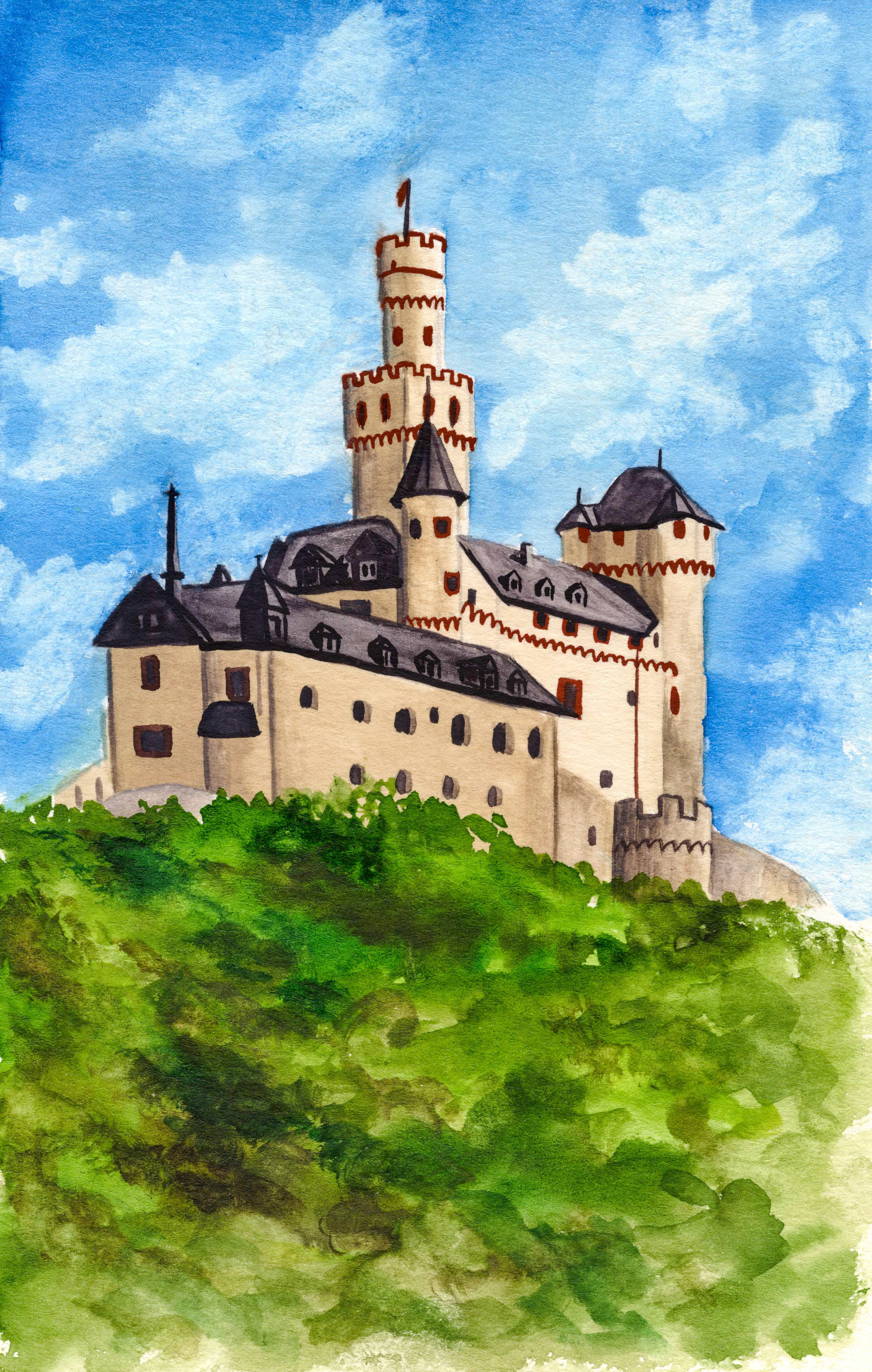 Die Marksburg bei Braubach wurde im 13. Jahrhundert errichtet und gilt als einzige Höhenburg am Mittelrhein, die nie vollständig zerstört wurde. Mit ihren Türmen, Mauern und Zwingern verkörpert sie die Stärke und Beständigkeit einer Epoche, in der Schutz und Macht untrennbar verbunden waren. Ein seltenes Original, das den Geist des Mittelalters authentisch bewahrt.