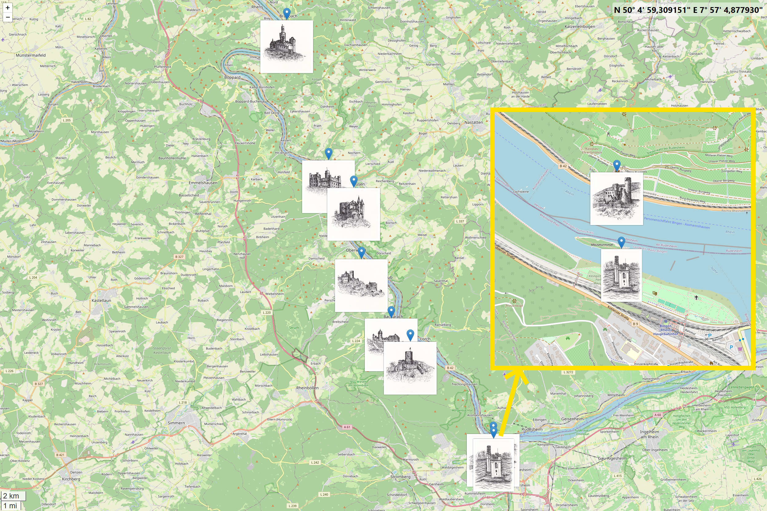 Karte: Standorte der Burgen am Mittelrhein