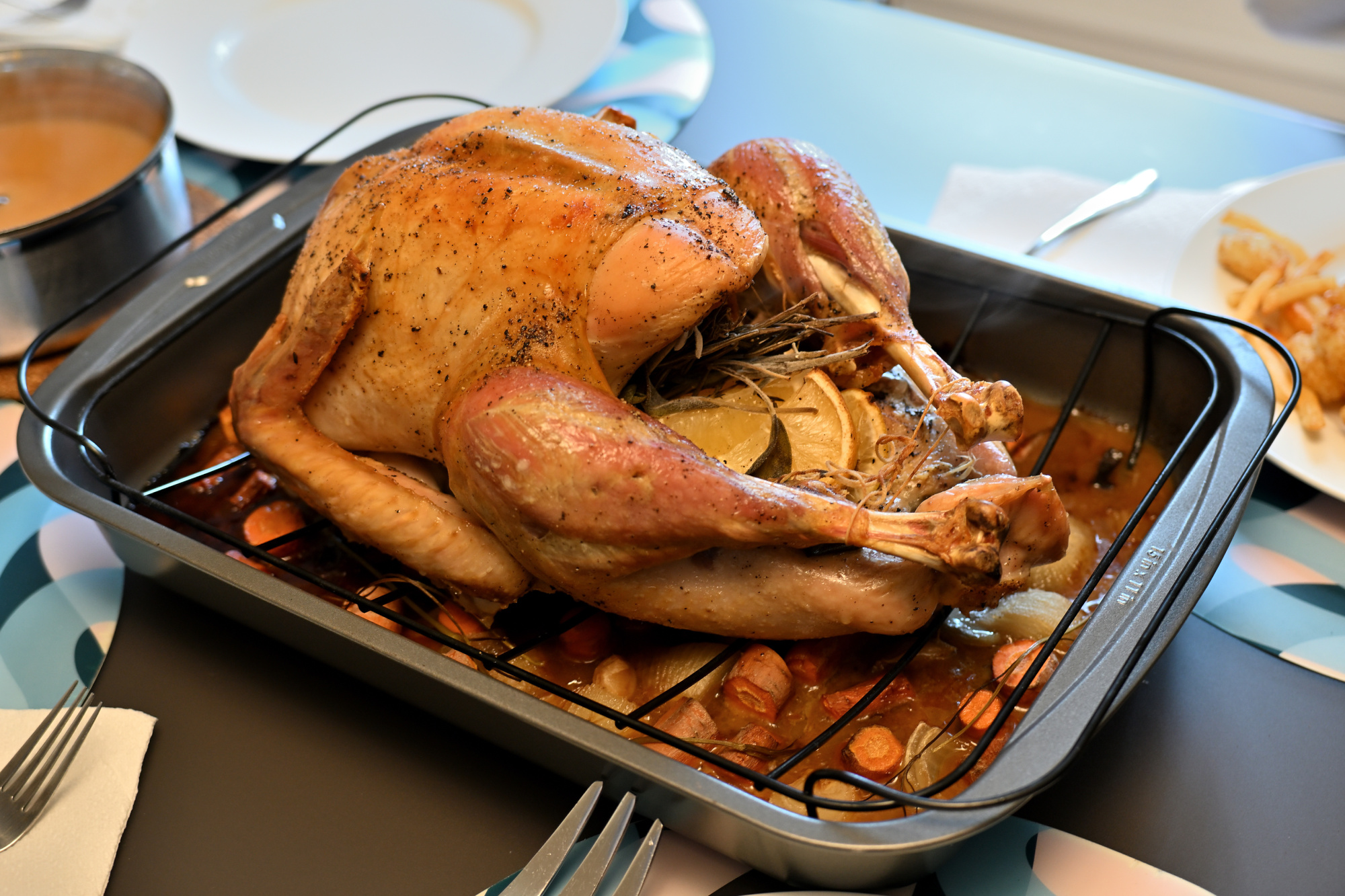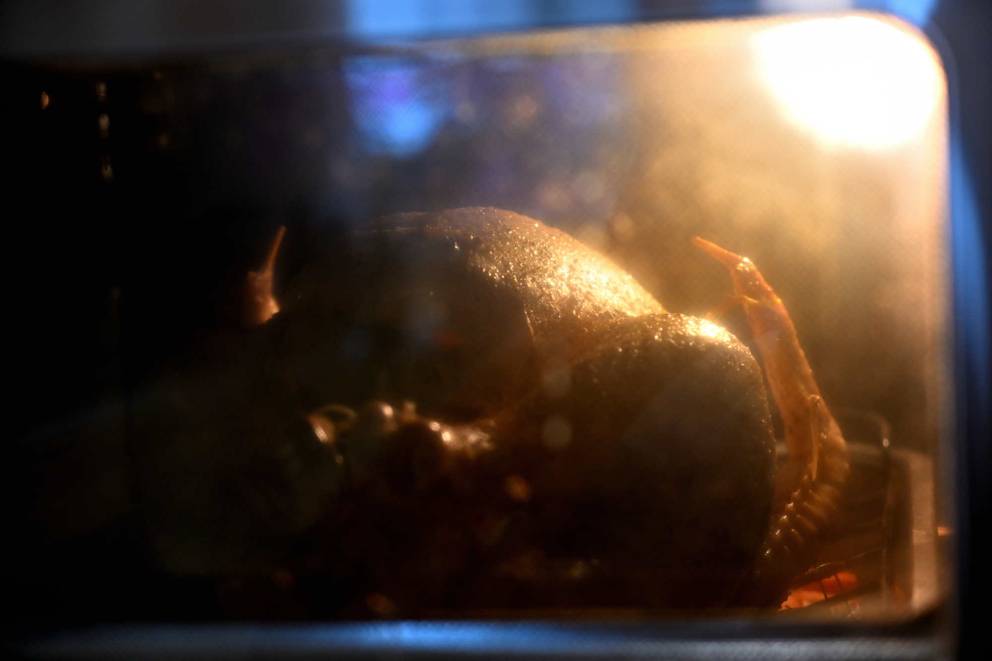 Focused manually because autofocus would have locked on the oven glass instead of the turkey inside.