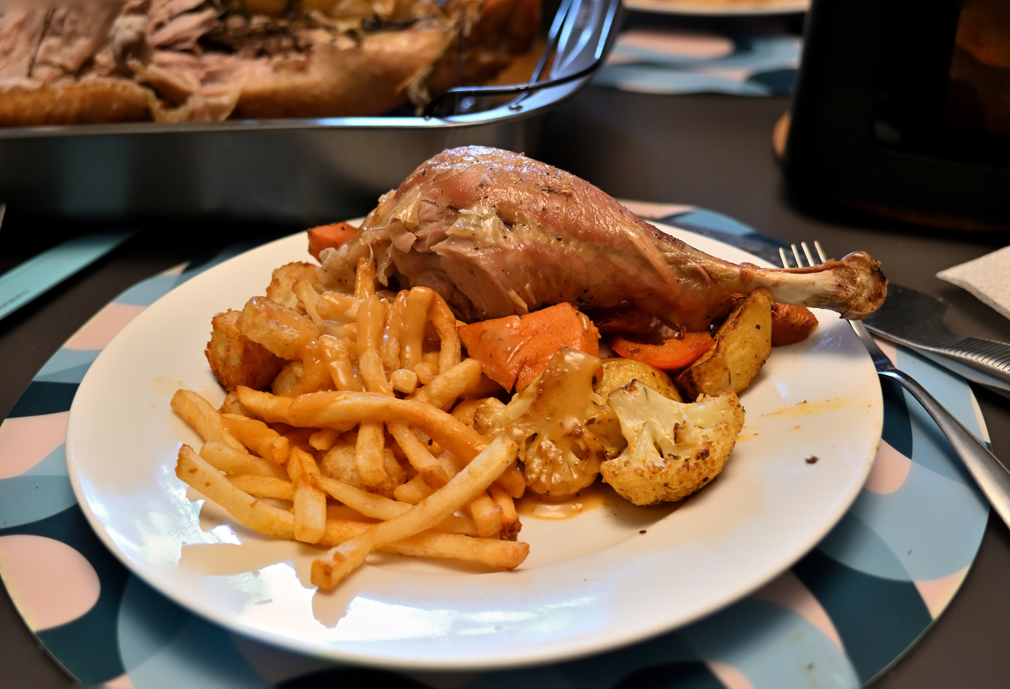 Hours pass. The turkey meditates in 170°C silence, contemplating its purpose. It emerges wiser, crispier, and slightly golden, proof that patience and heat can turn blandness into brilliance.