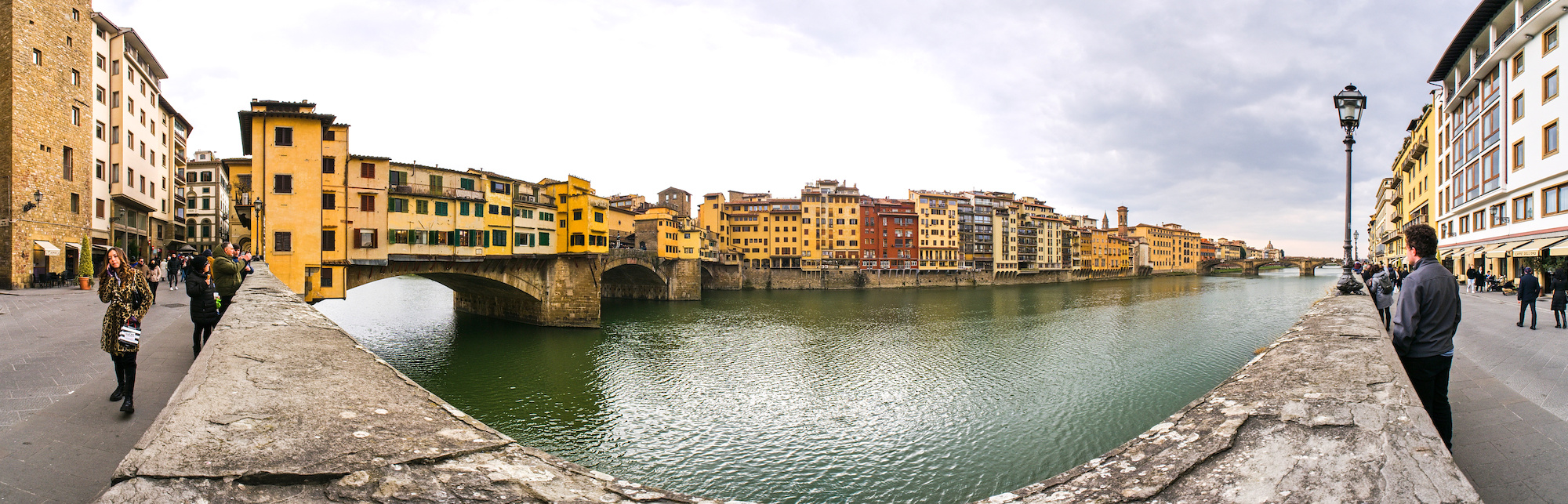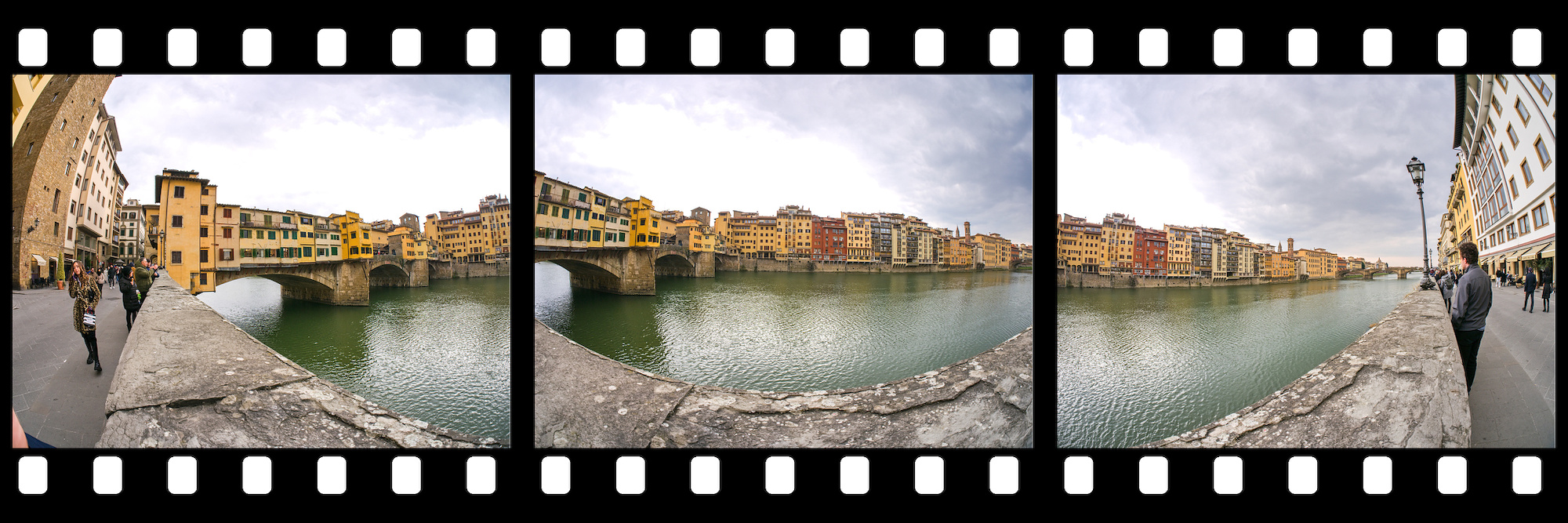 The 1x3 pano of the Ponte Vecchio shows the famous bridge in Florence, hosting lots of shops.