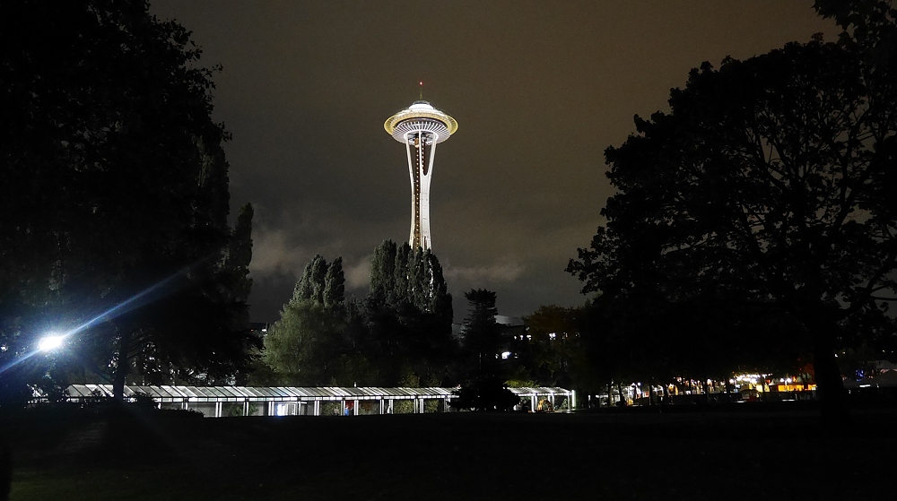 One the way back, a view on the newly renovated Space Needle in the moon light. This was just one 12mm shot.