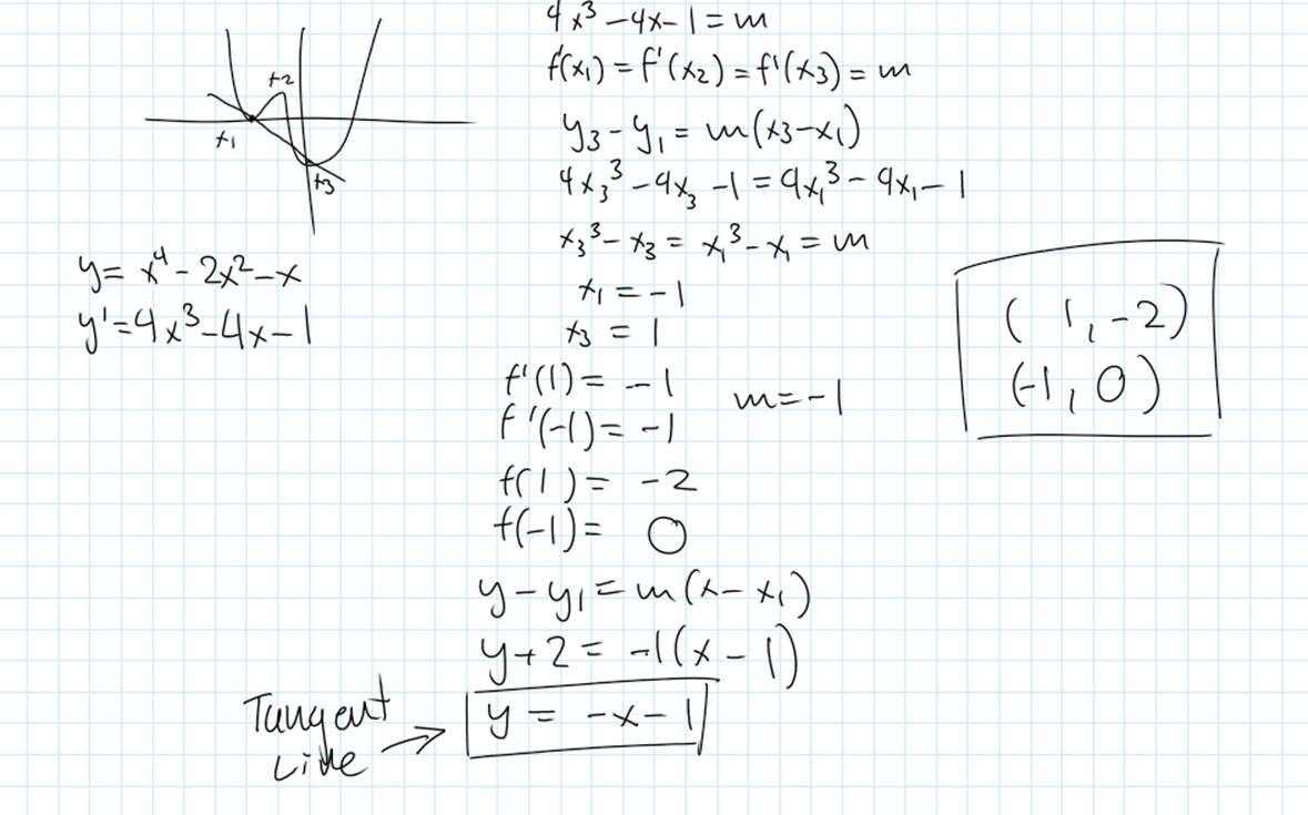 The key is to derive two equations from the derivative. With a fourth-degree polynomial, we get three points where the slope is the same, but only two of them share a common tangent line.