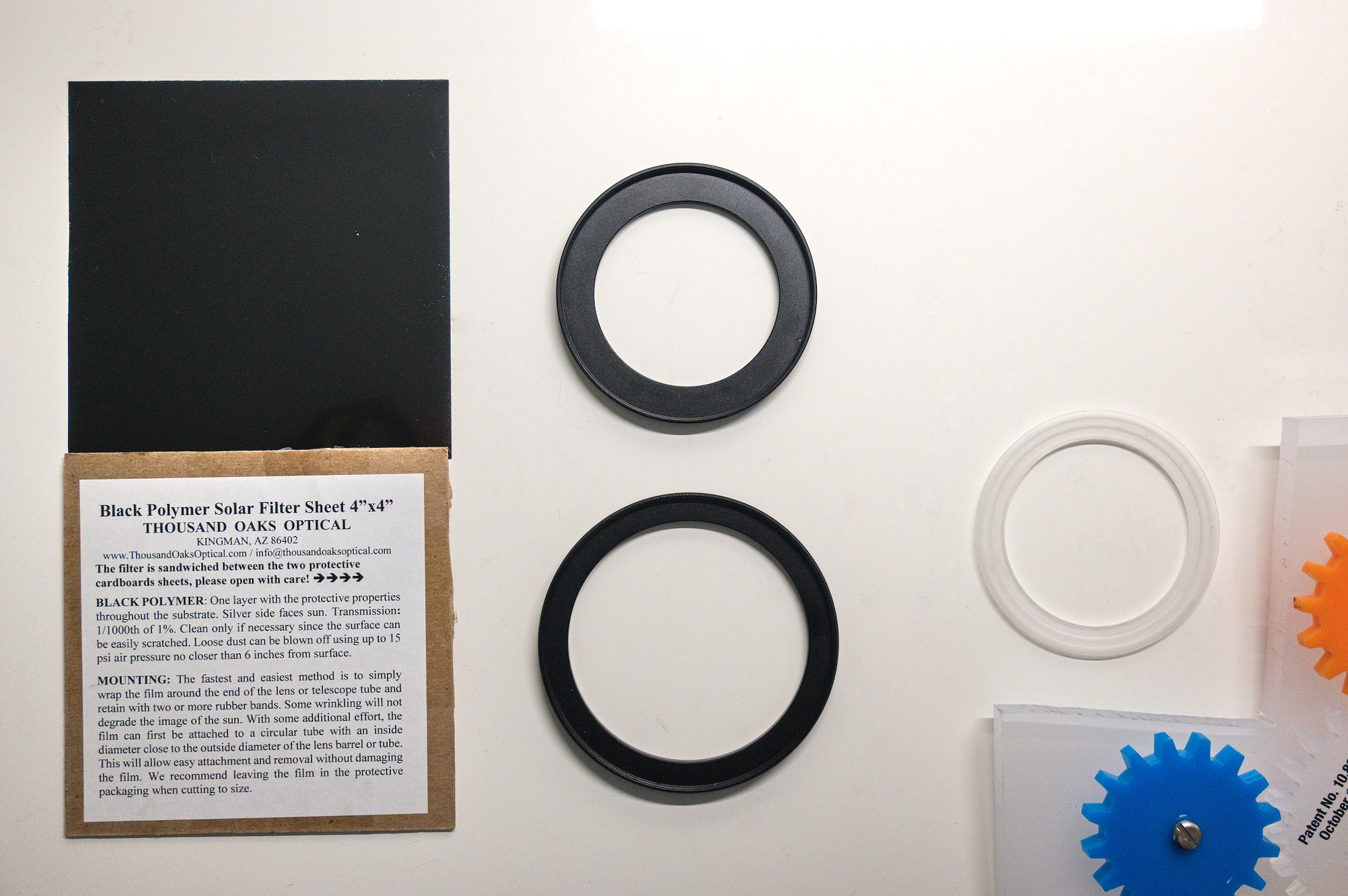Dazu braucht man nur Filterfolie, die dem ISO 12312-2 Standard entspricht, und mit zwei Filterringen gehalten wird.- 10cm x 10cm Filterfolie (die hat eine Übertragung von 1:100000, enspricht 16.6 Blendenstufen, 2^16.6 ≈ 100000)