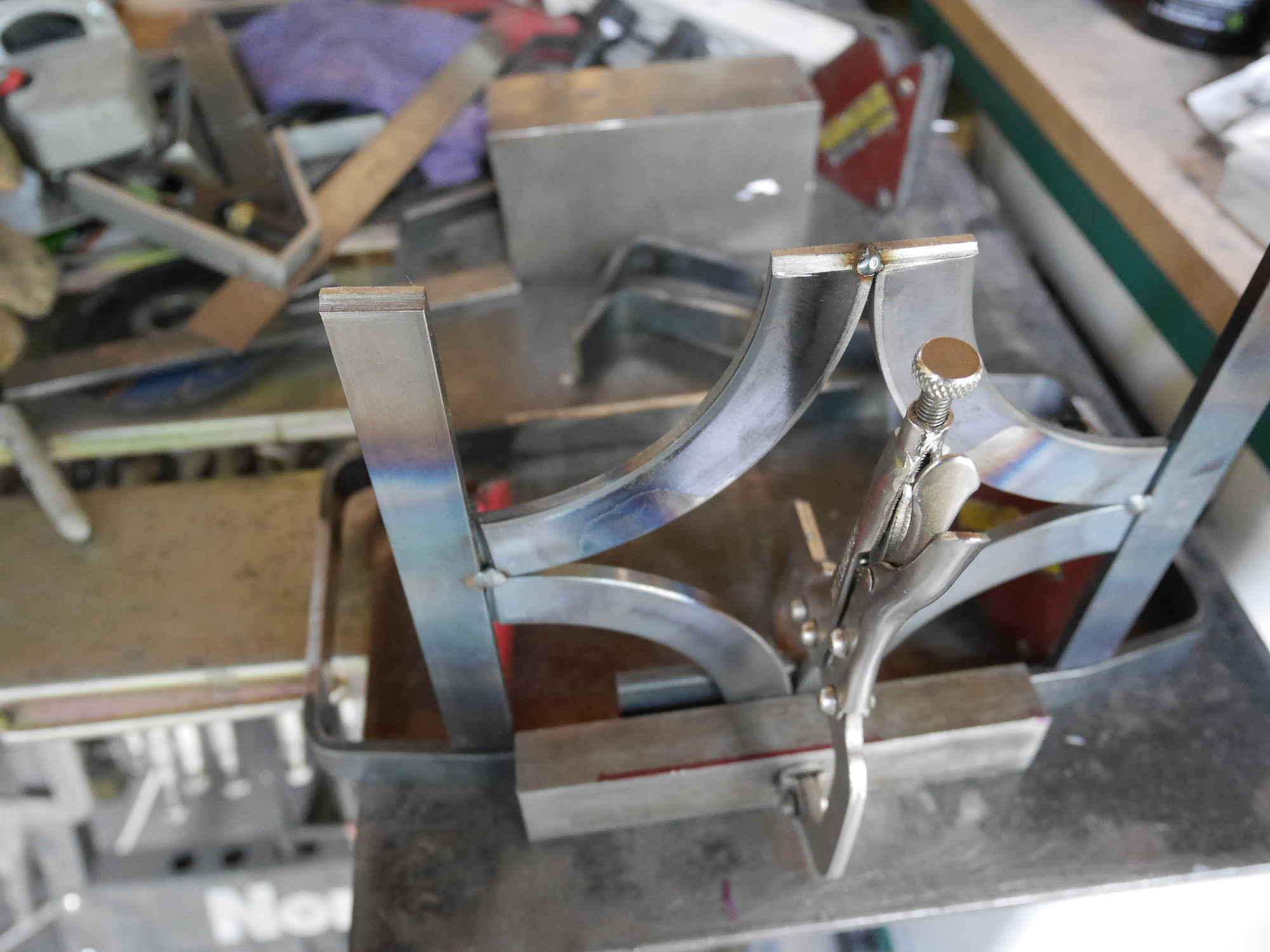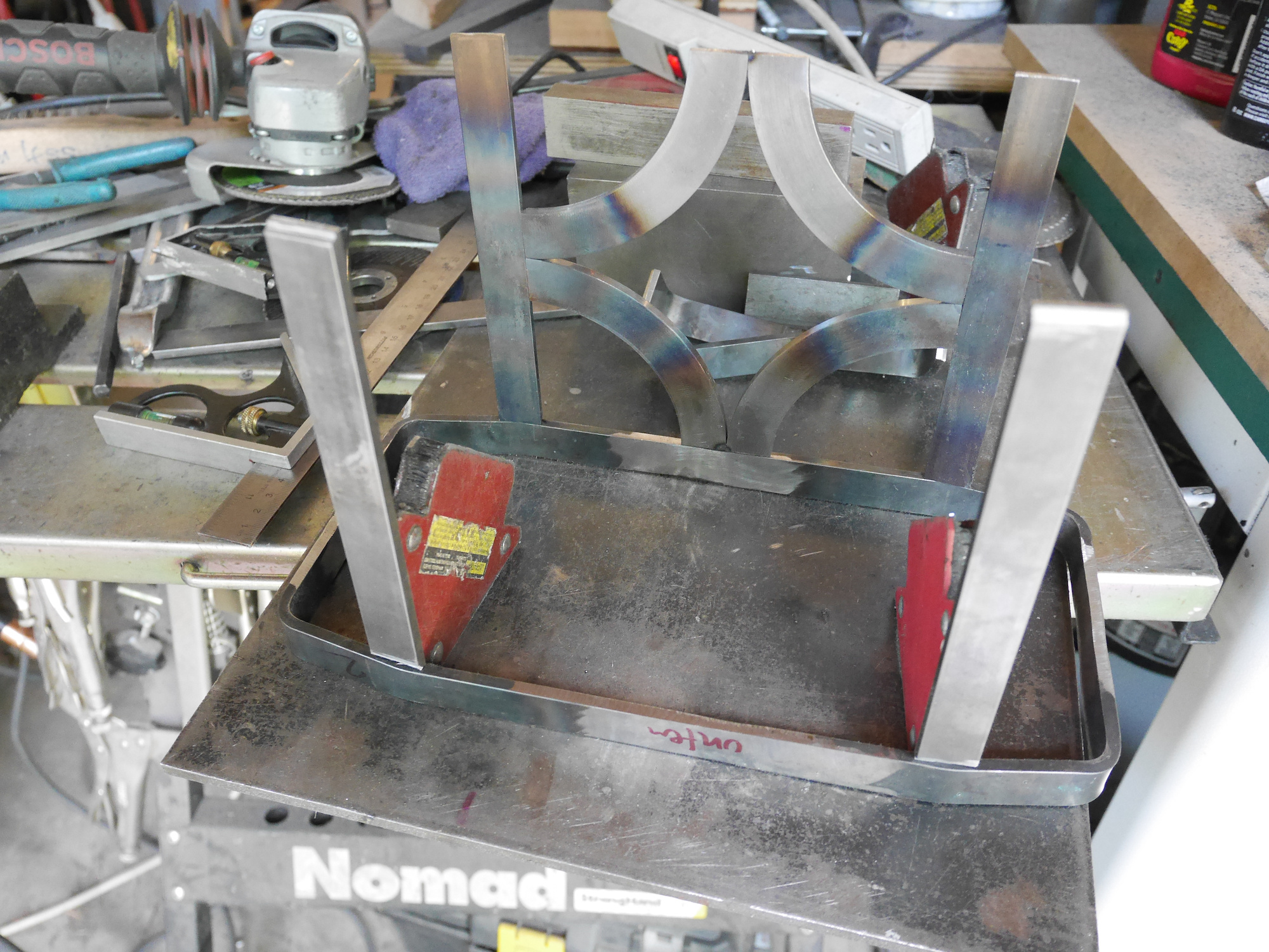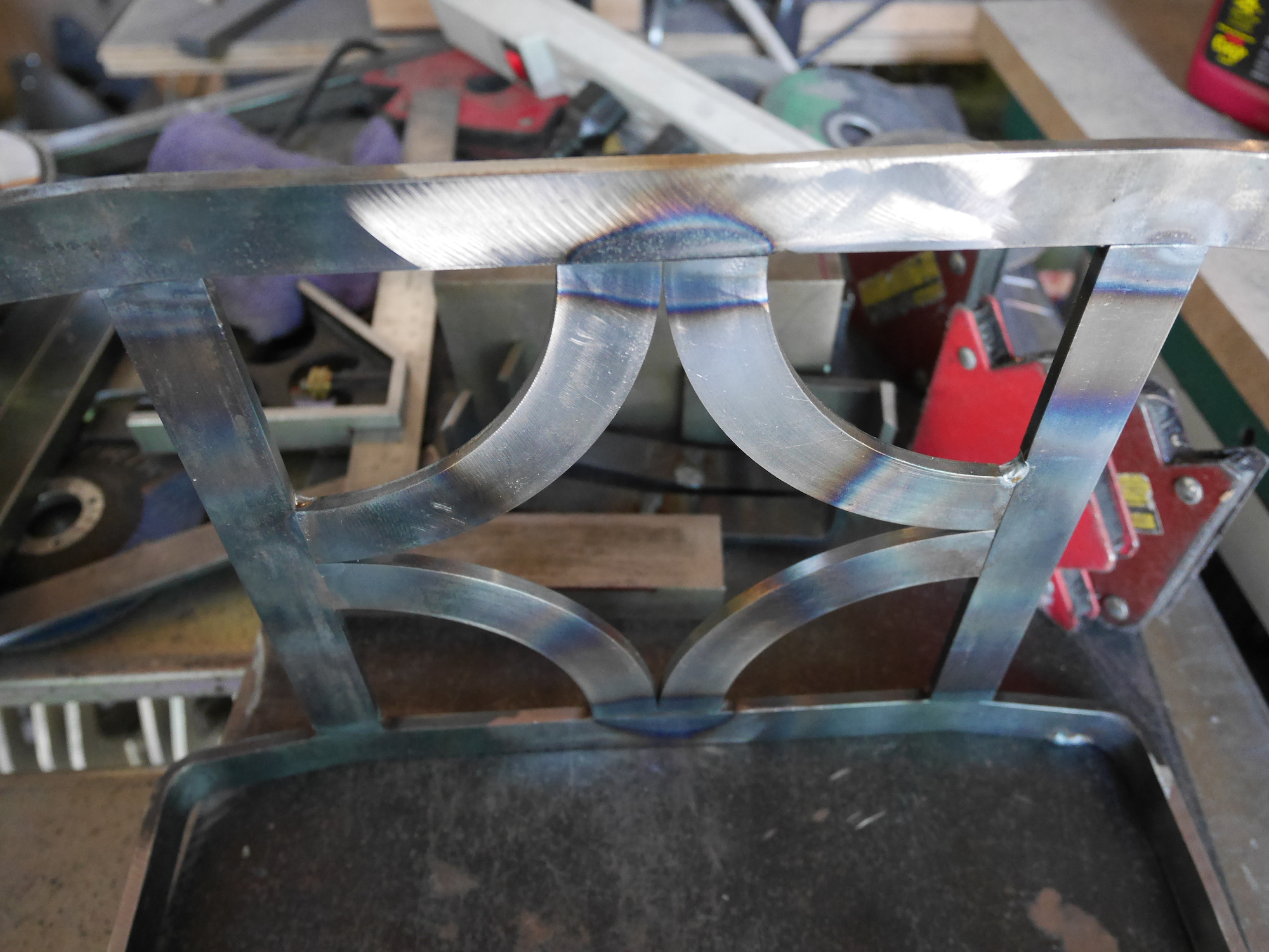Alle Teile werden jetzt zusammengeschweißt. Die Rundbögen sind von einem Kranz aus einer Bremse, die in 4 Teile geschnitten worden ist: