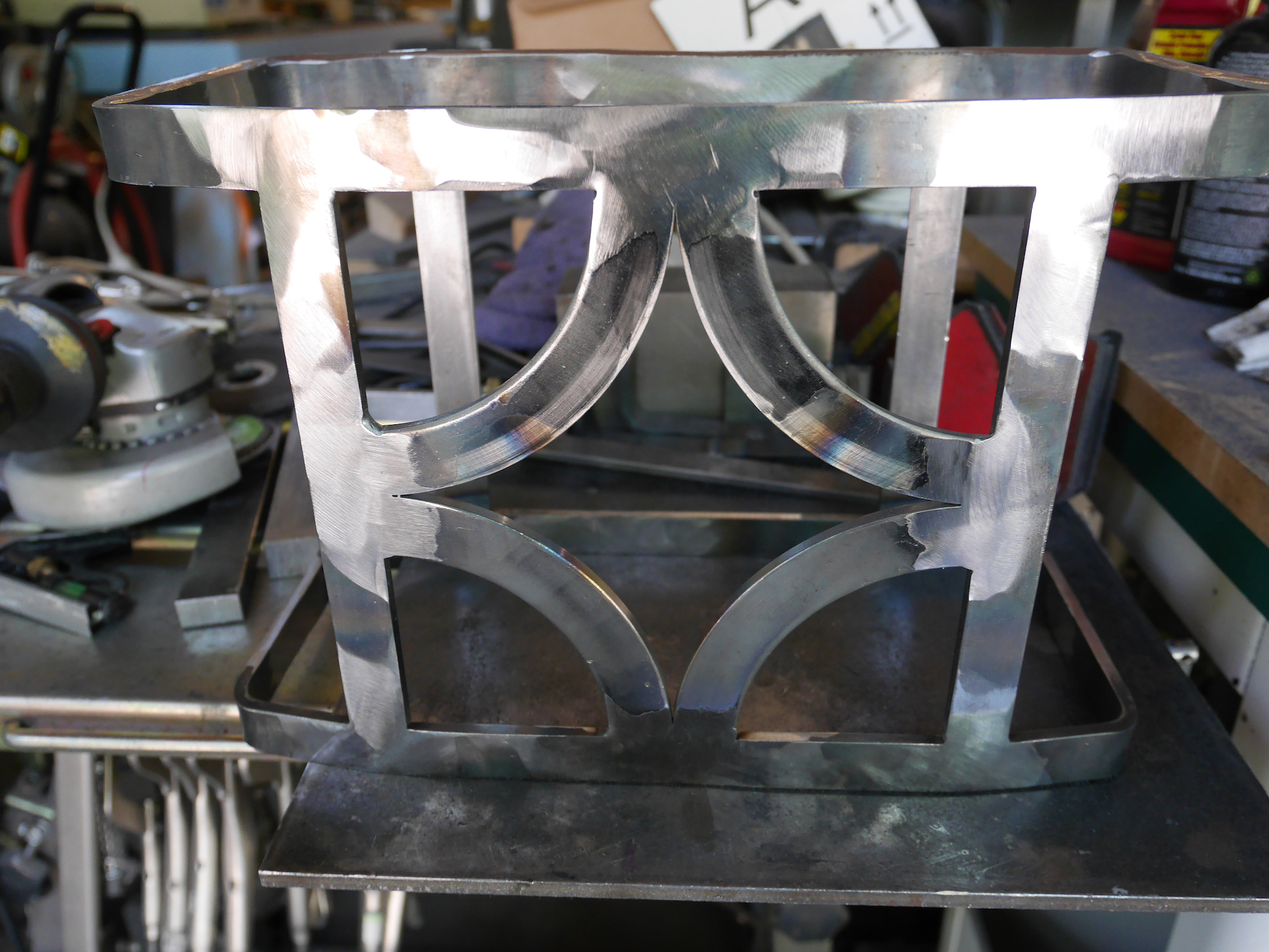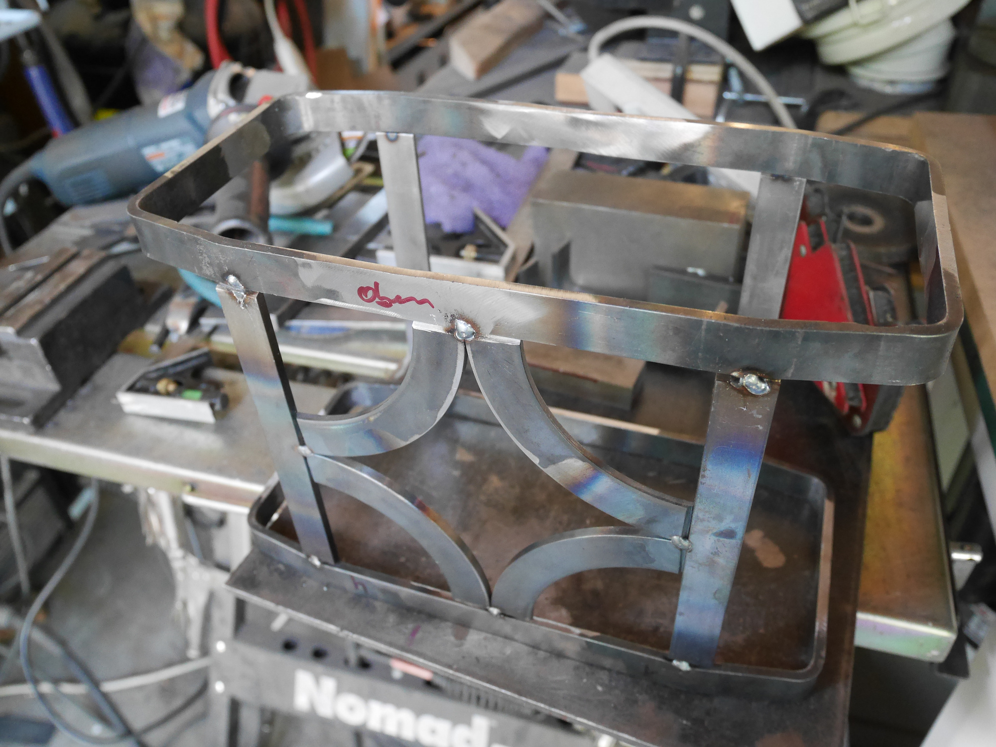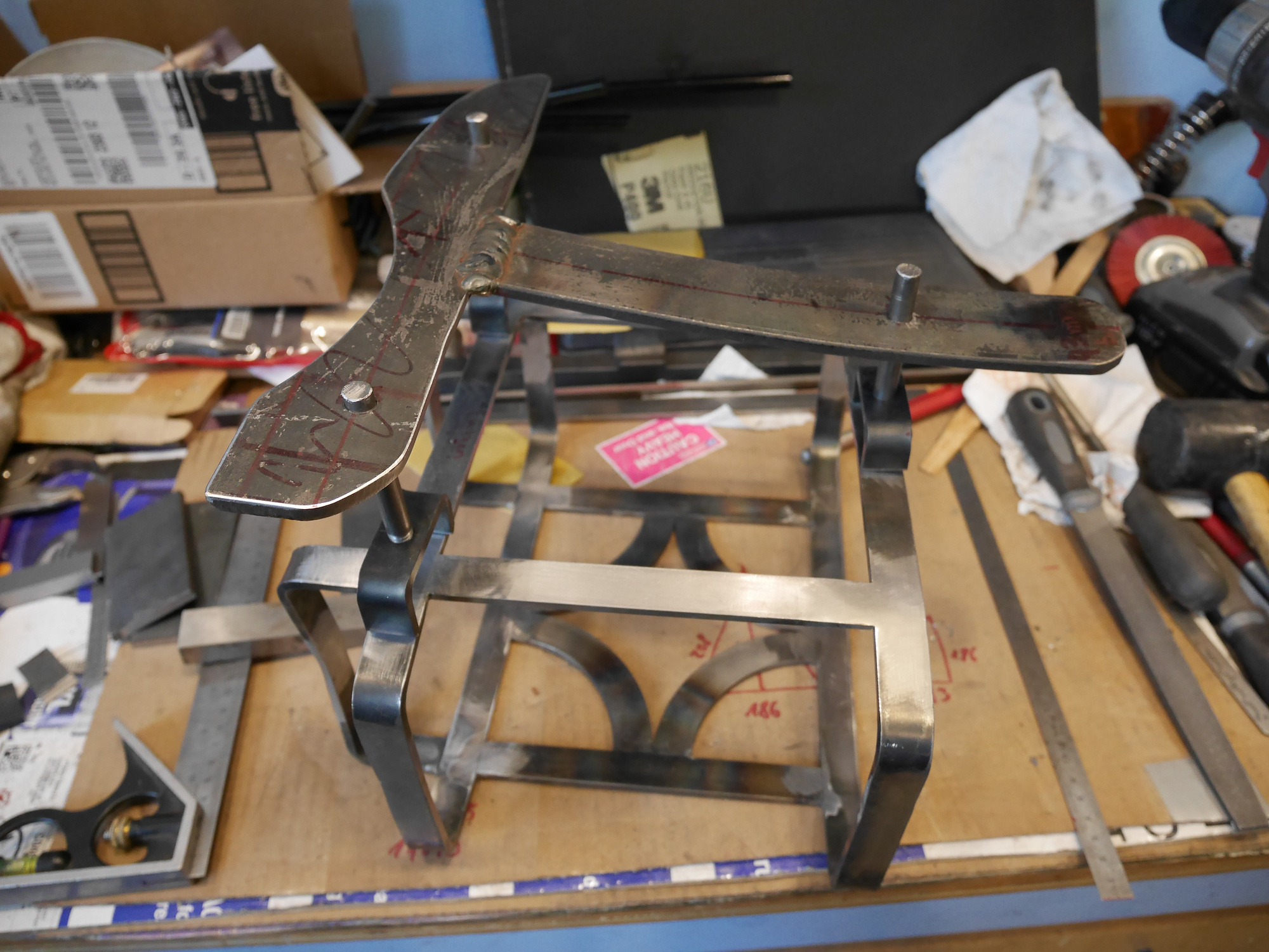 Alle Teile werden jetzt zusammengeschweißt. Die Rundbögen sind von einem Kranz aus einer Bremse, die in 4 Teile geschnitten worden ist: