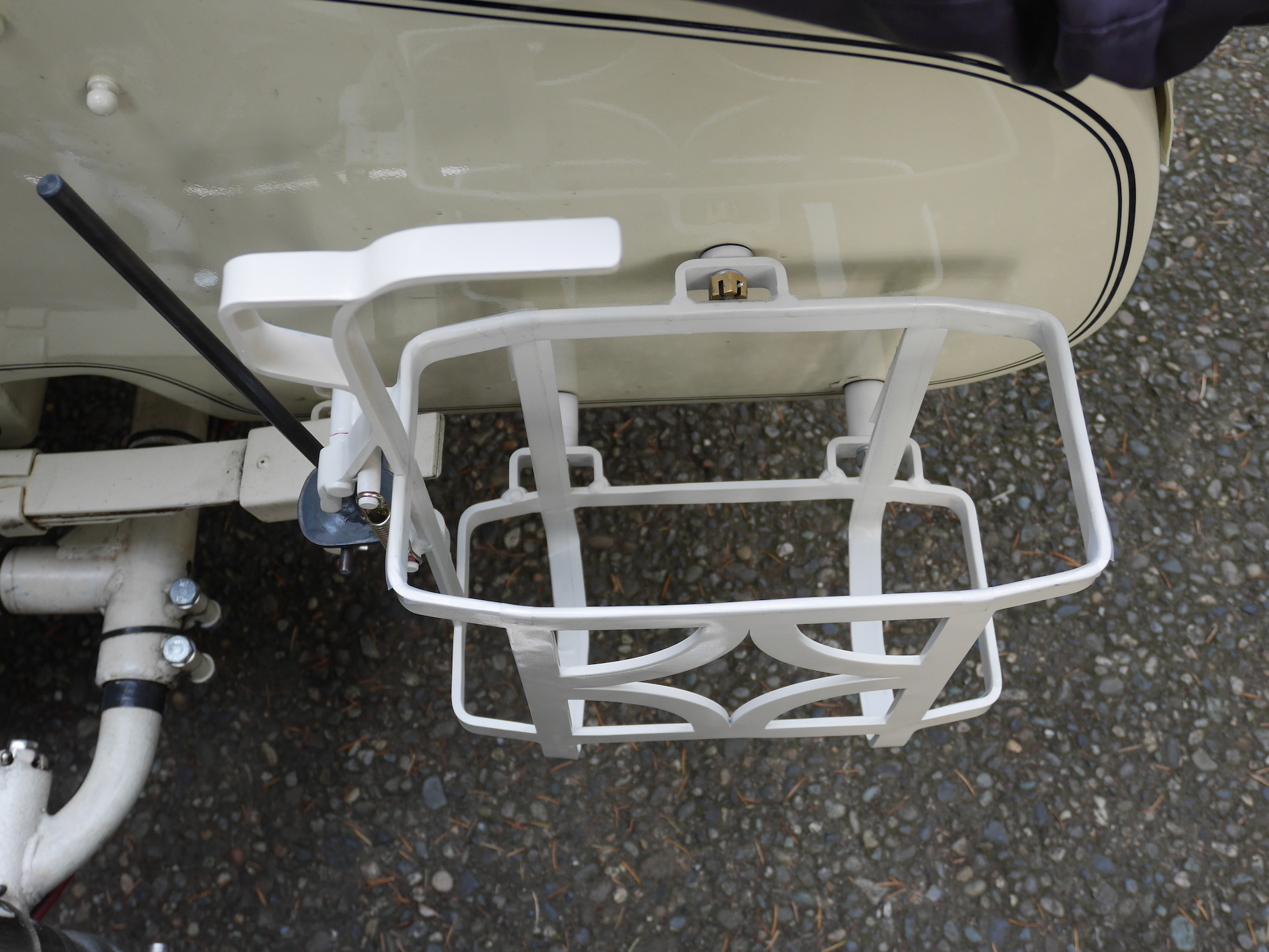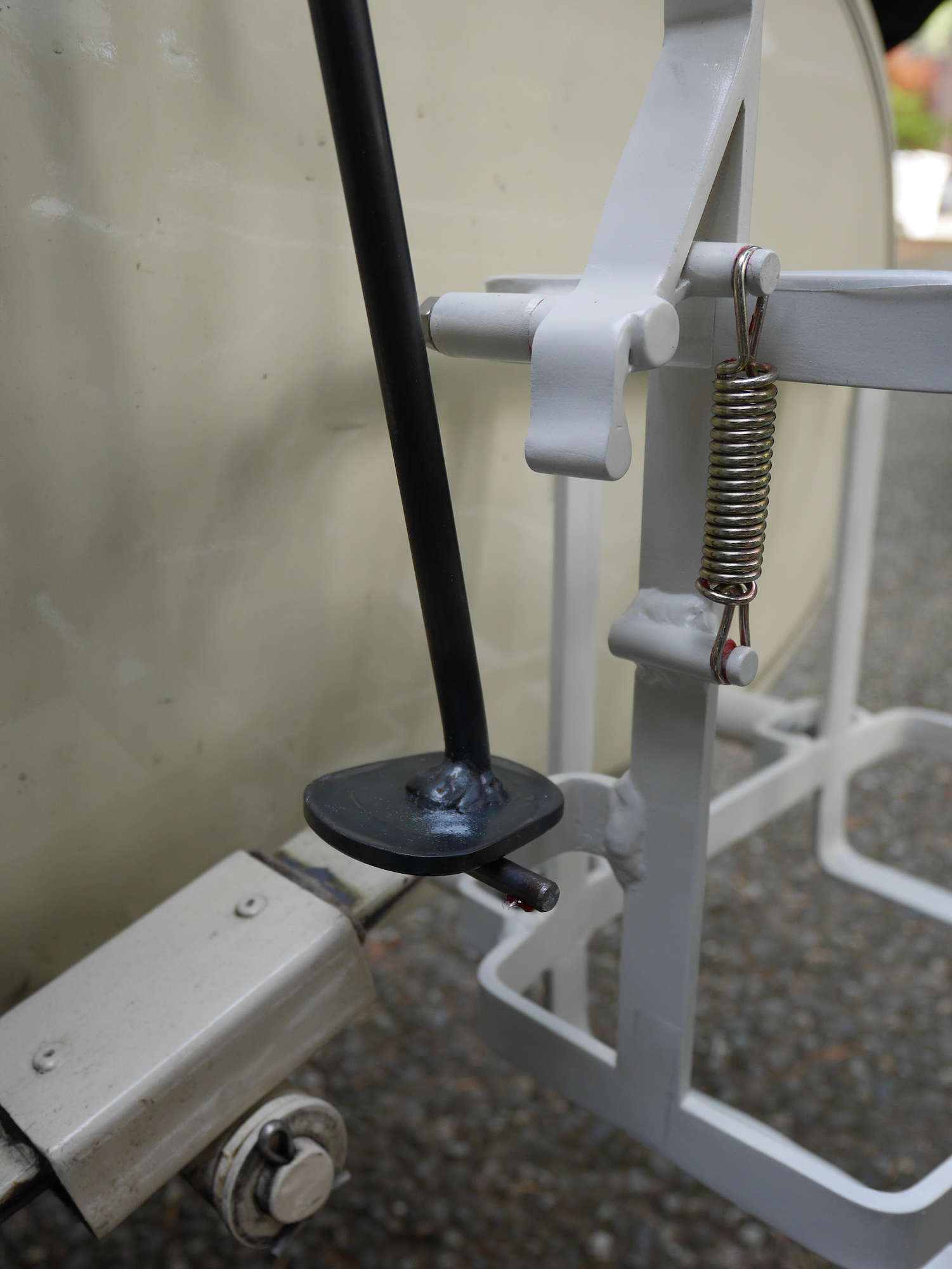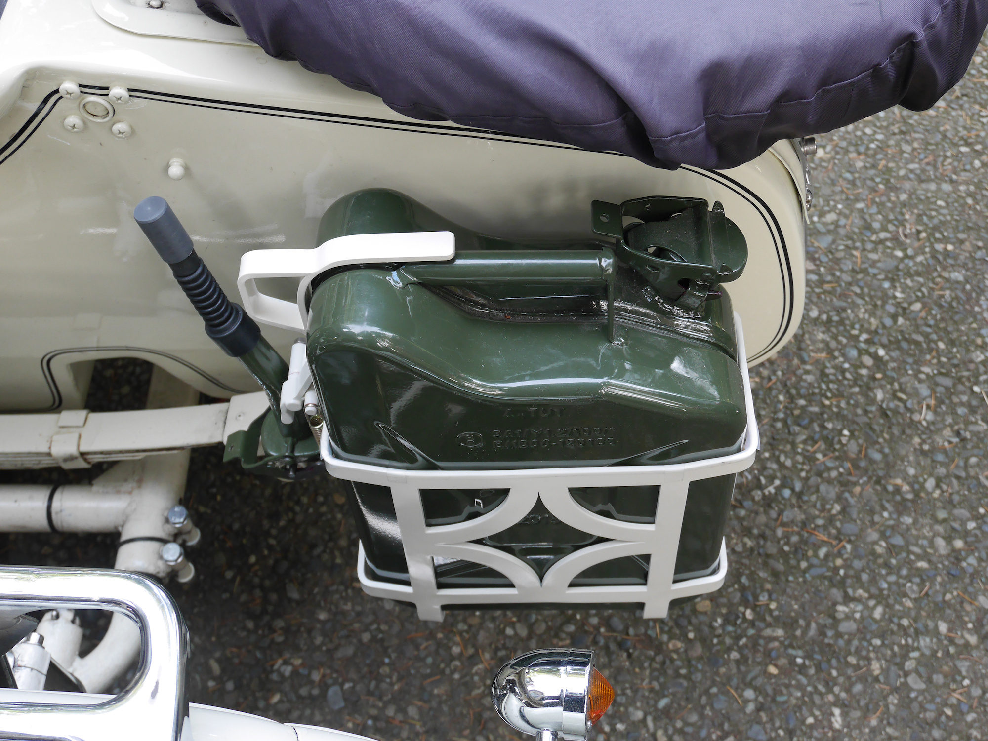 Der Bügel wird mit einer Feder gespannt und hält den Benzinkanister.