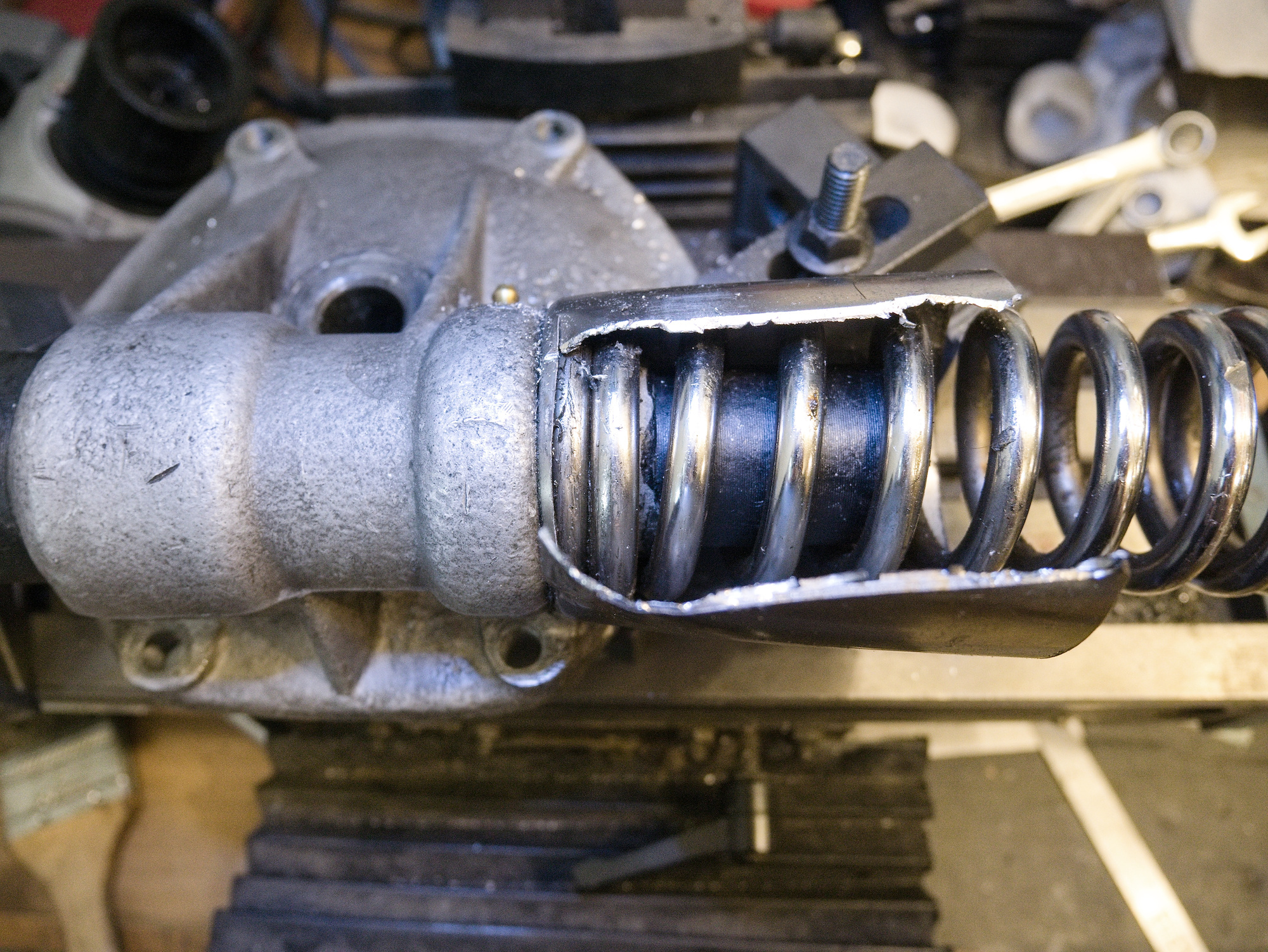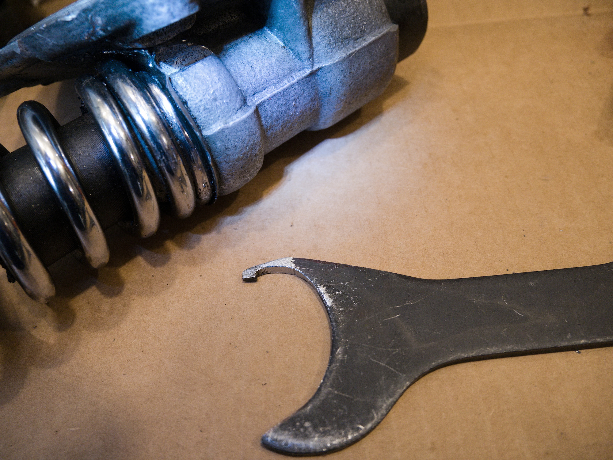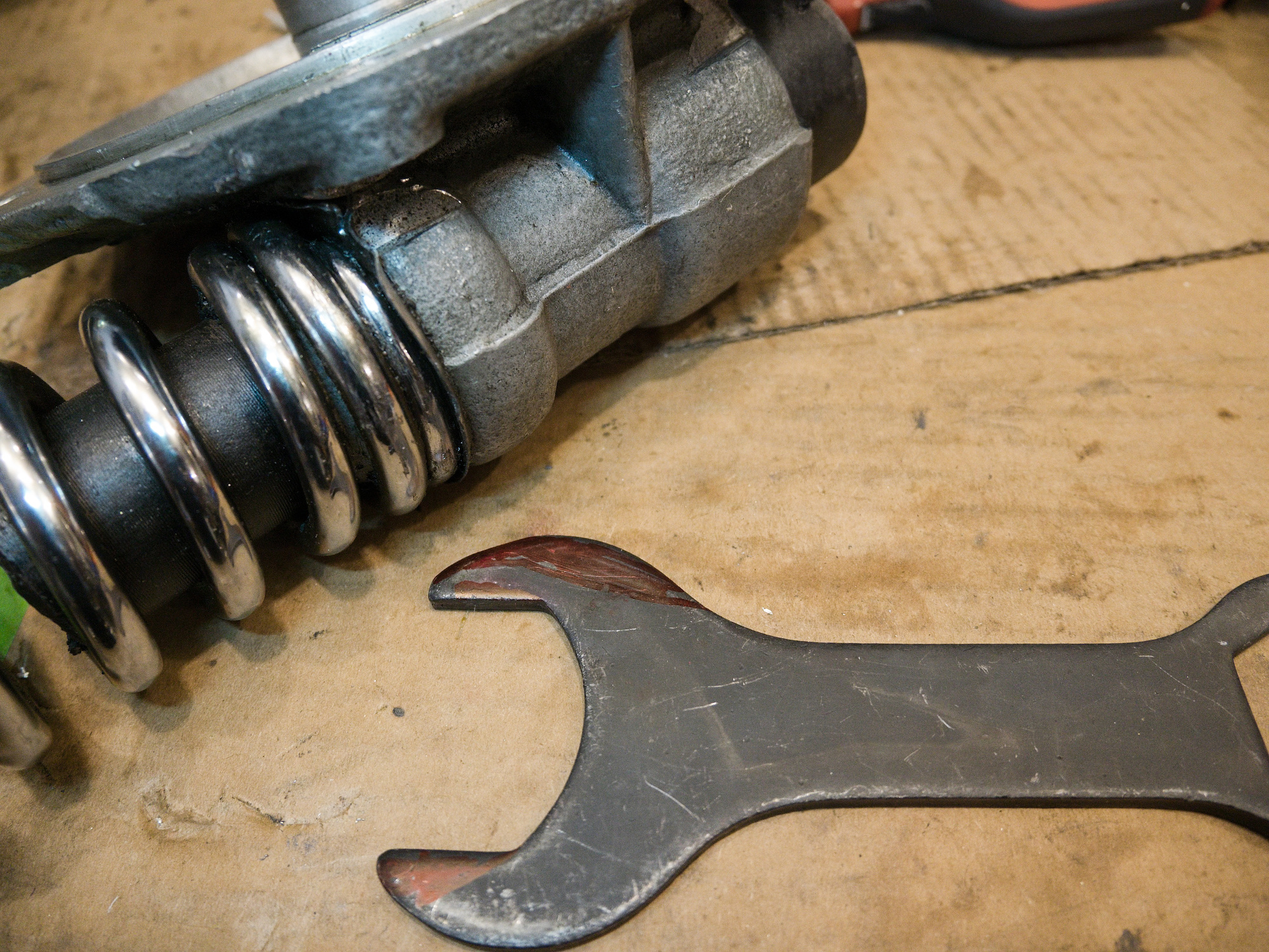 To try to turn the spring, a spanner is modified to hook into the end of the spring.