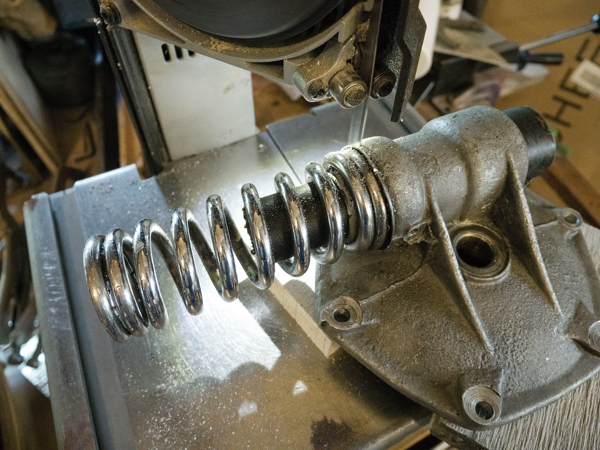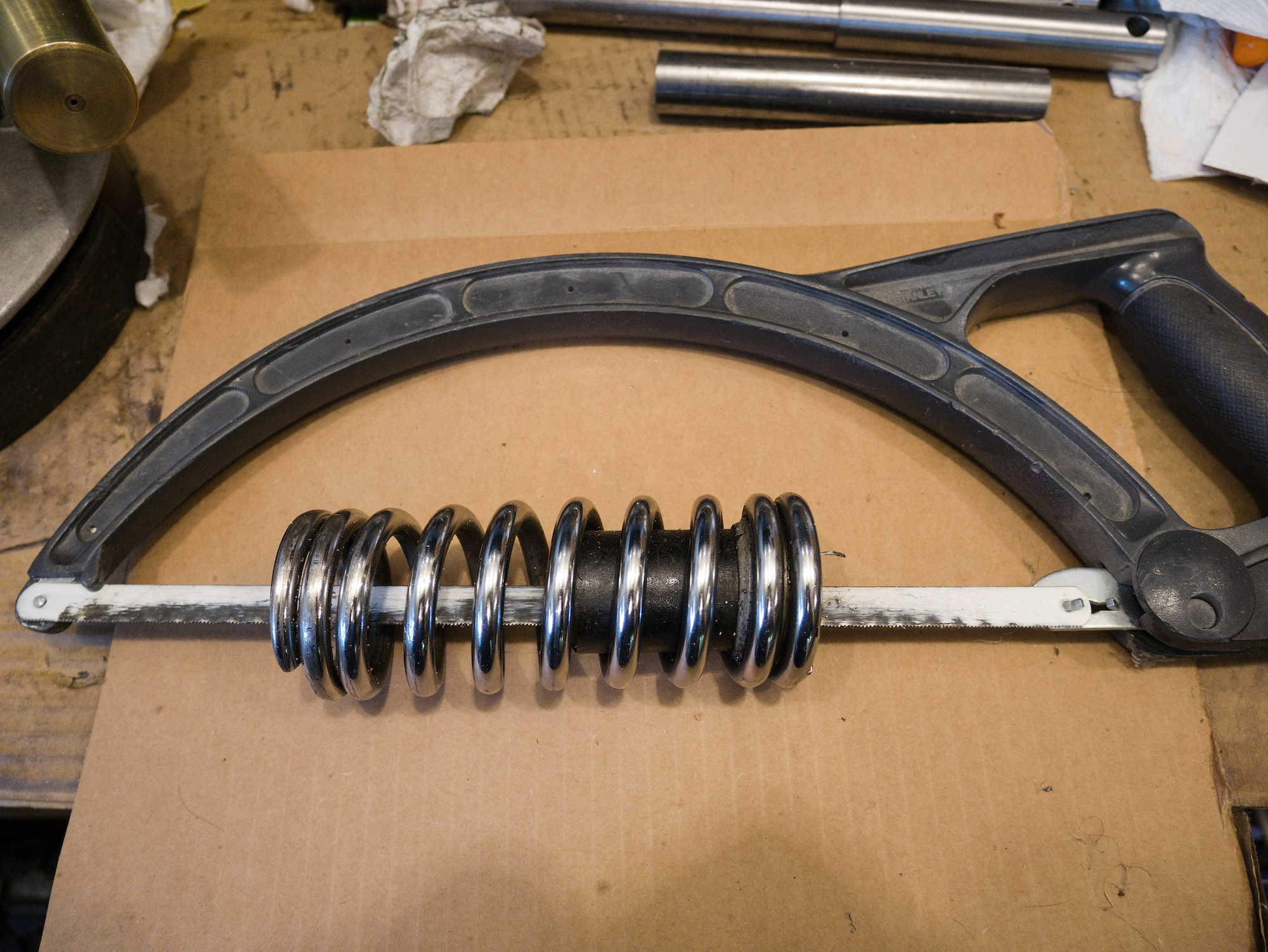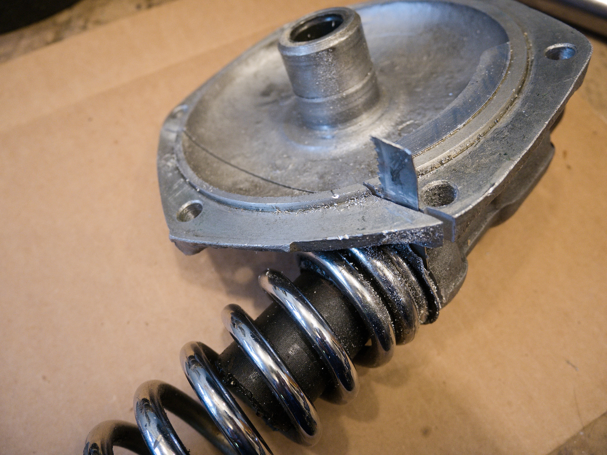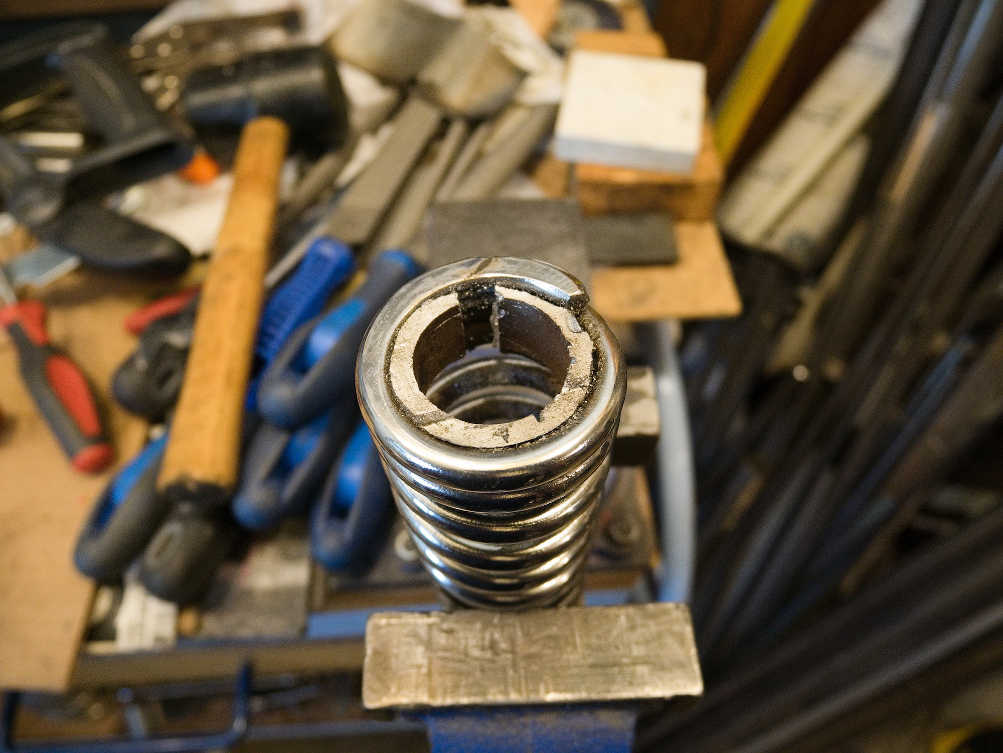 To try to turn the spring, a spanner is modified to hook into the end of the spring.