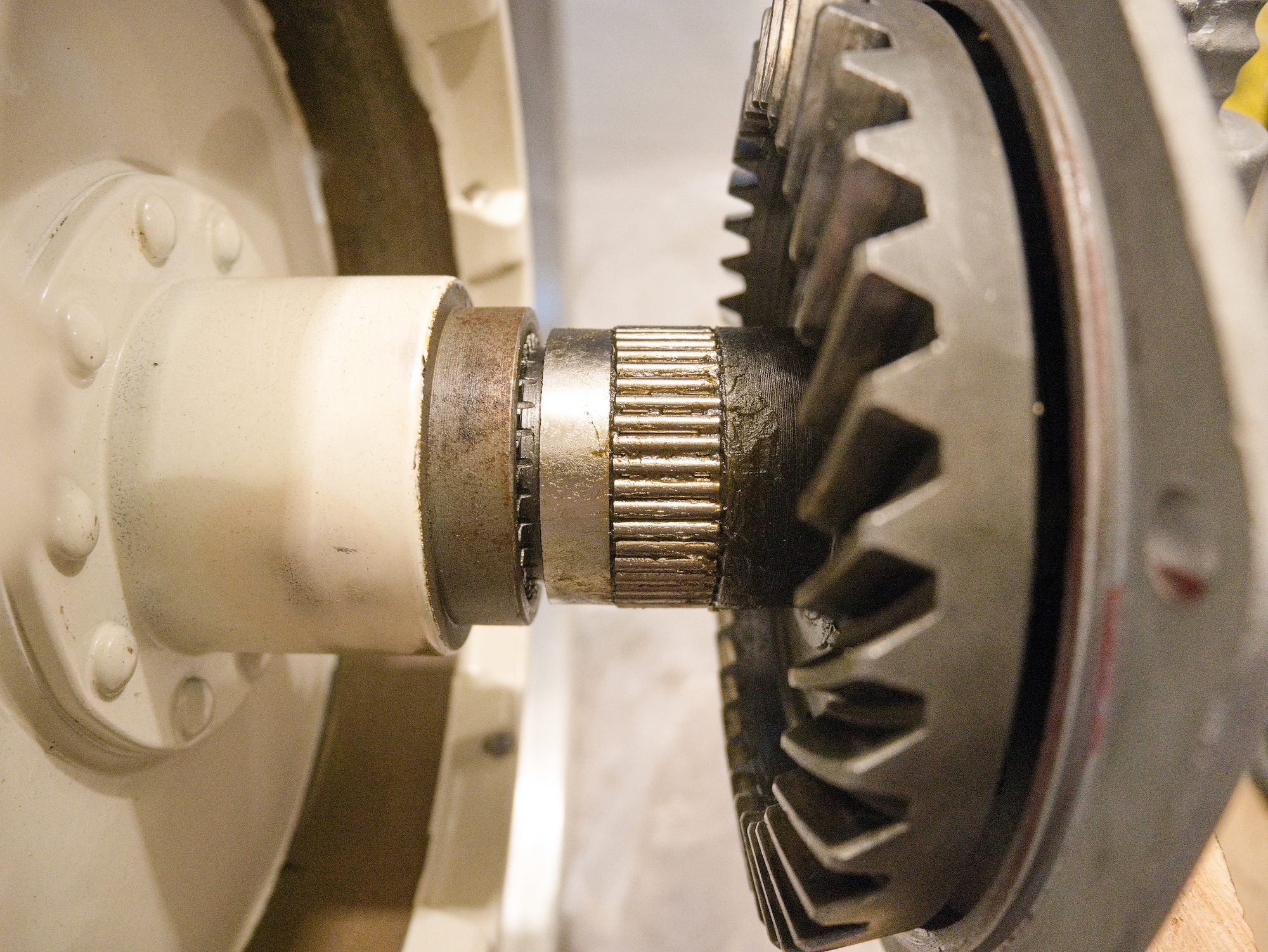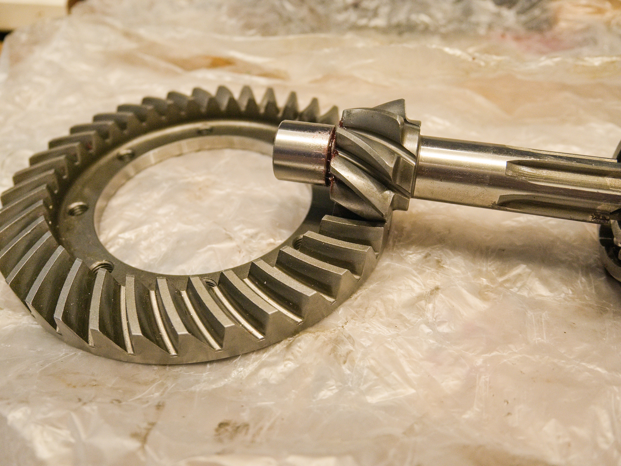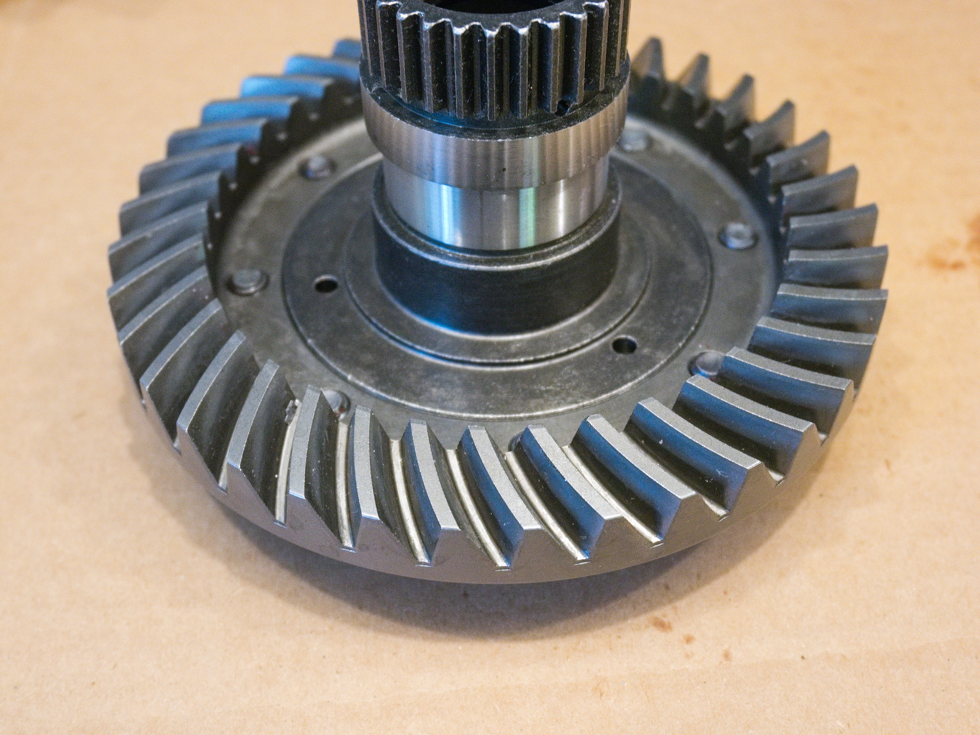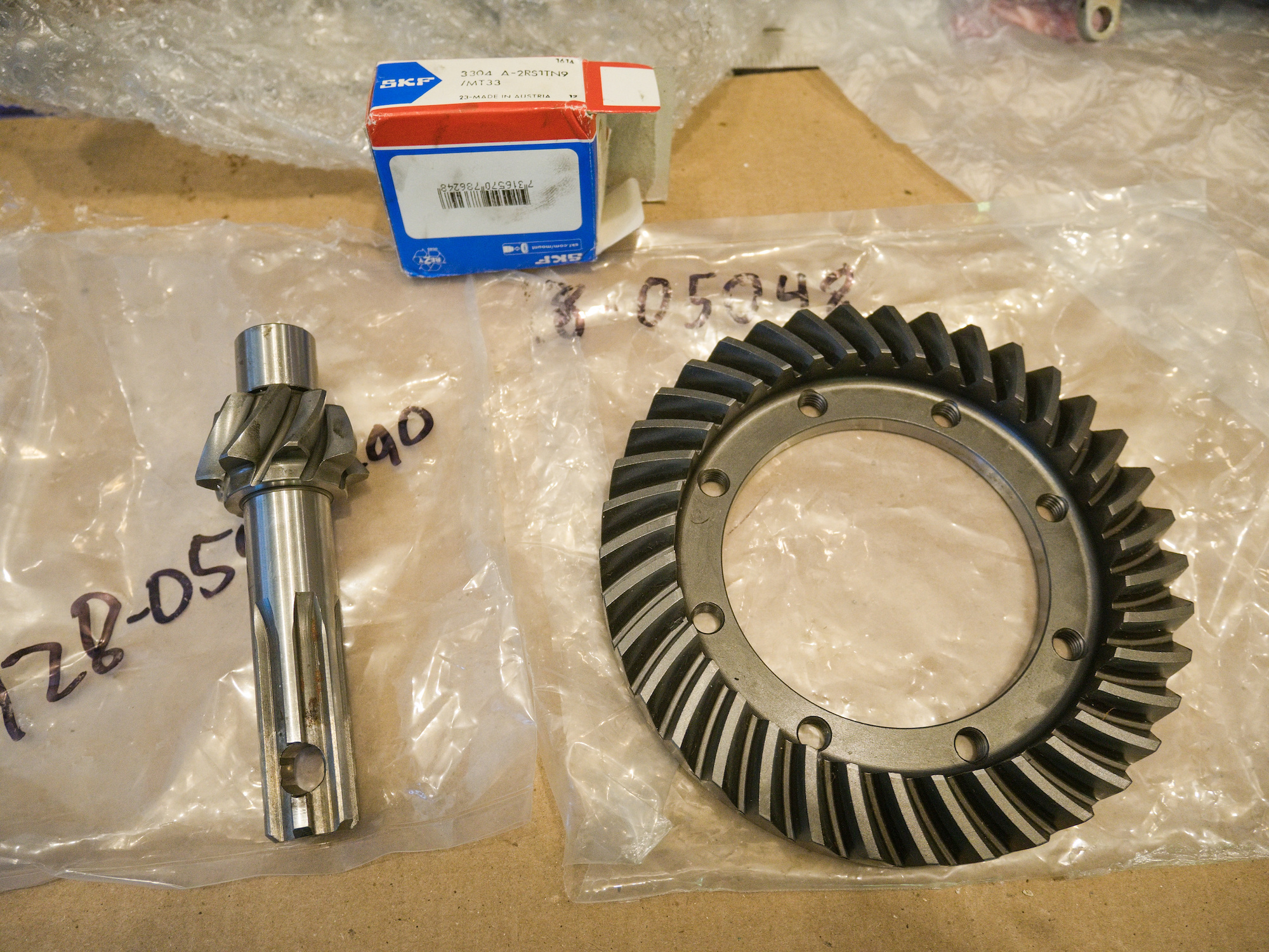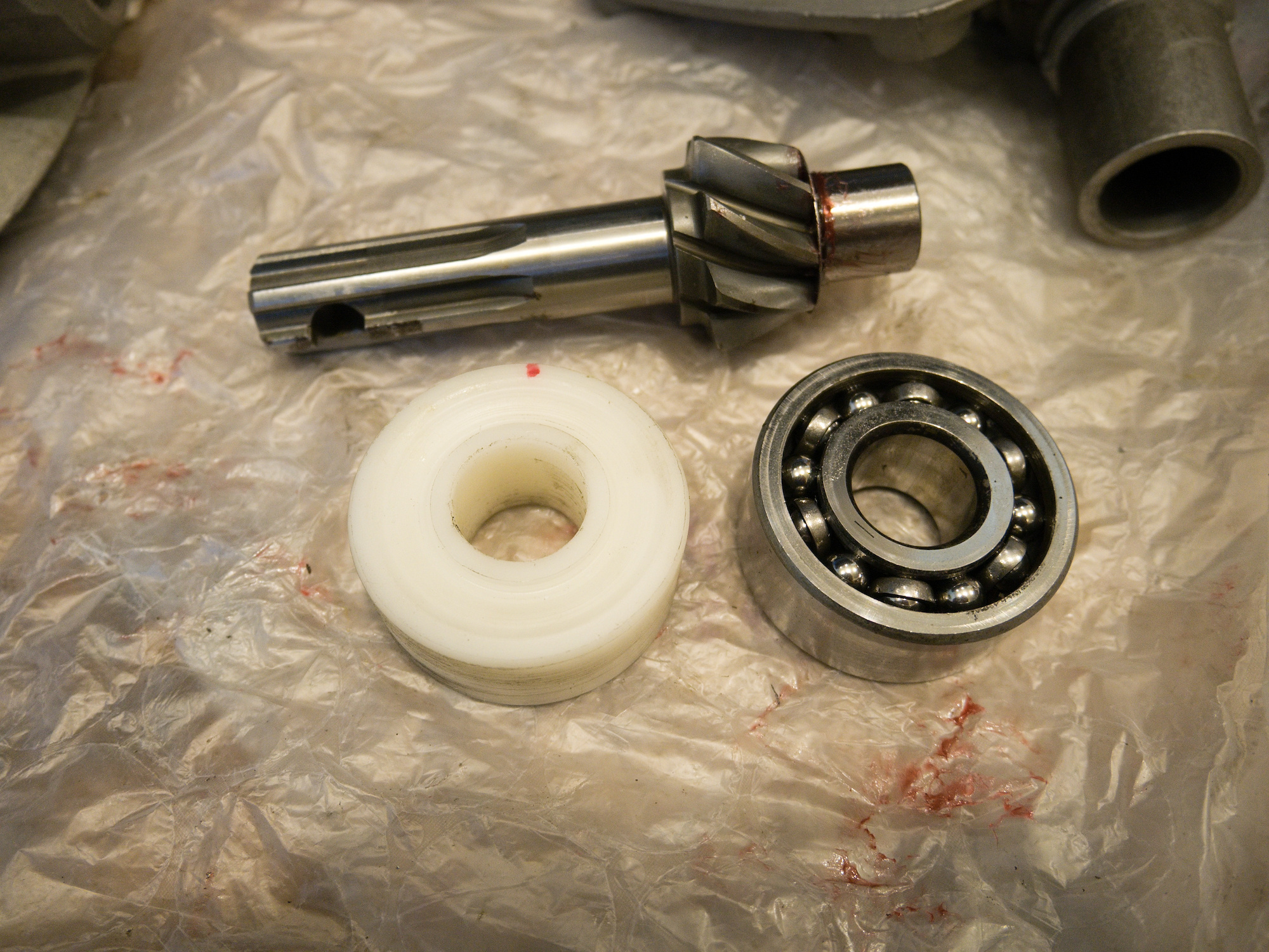 The 3304 gets pressed on later to the pinion gear shaft. For the contact pattern, a plastic guide with the same dimensions as the bearing is used to make it easier to move the gear in and out of the casing.