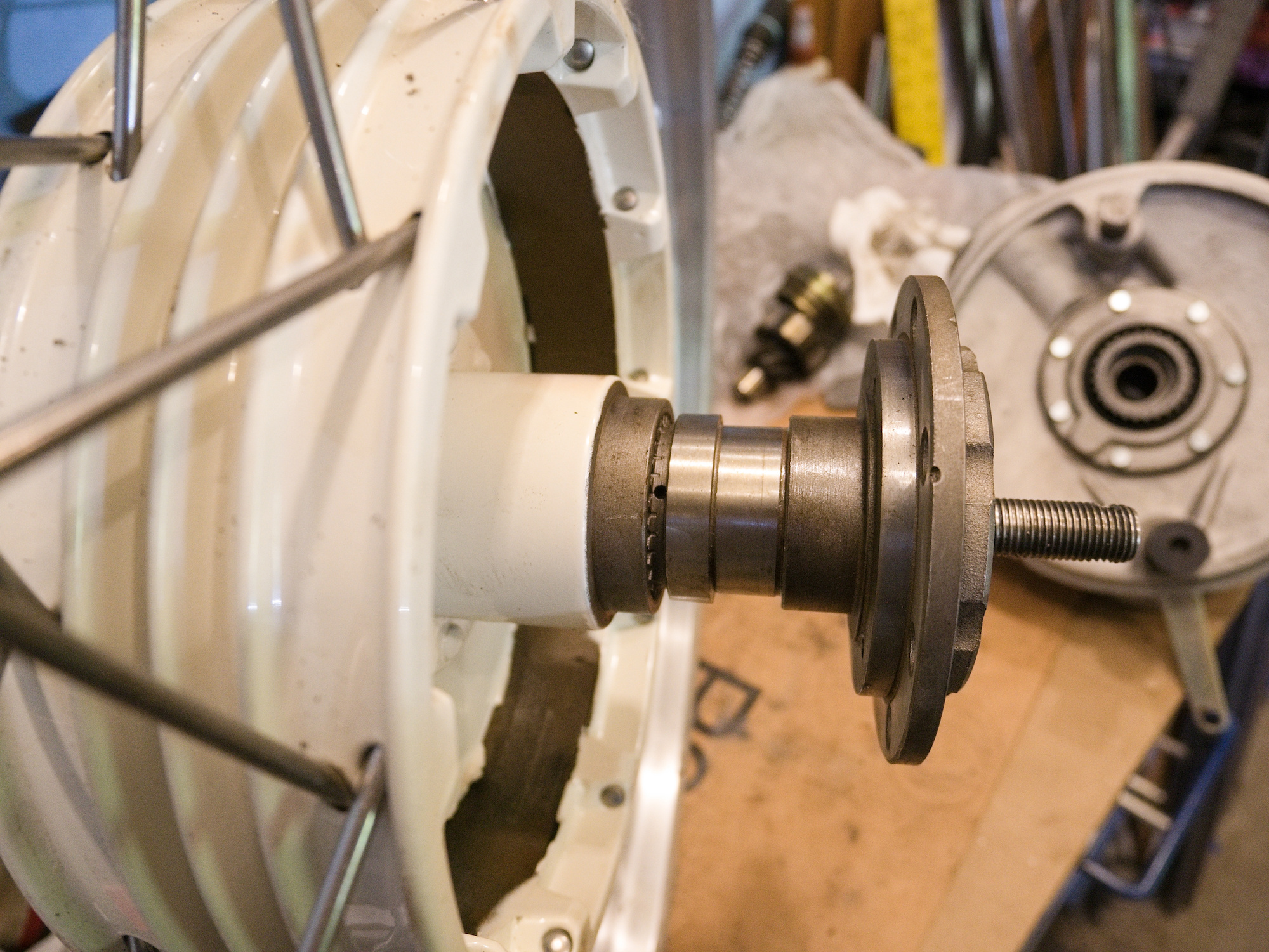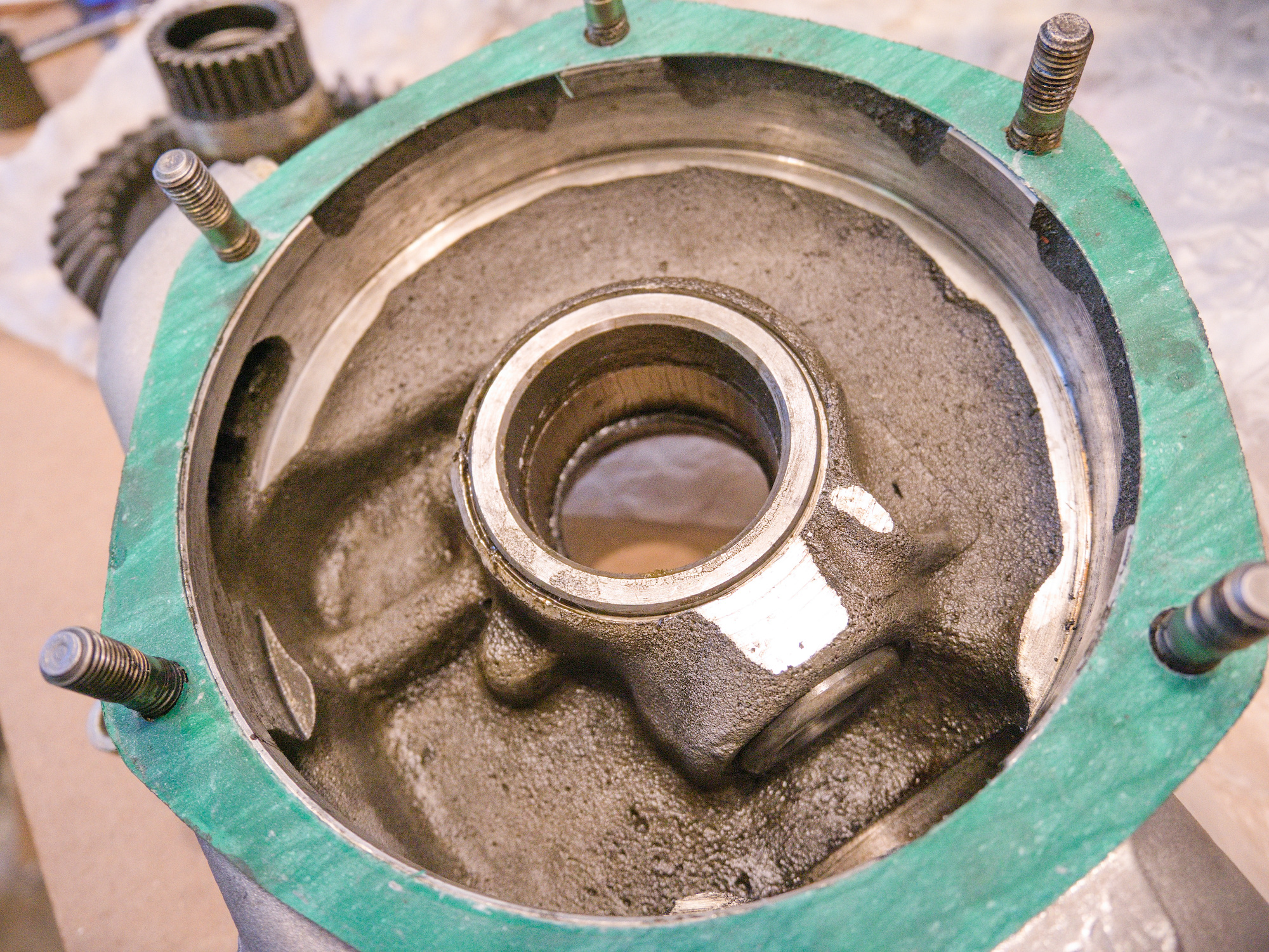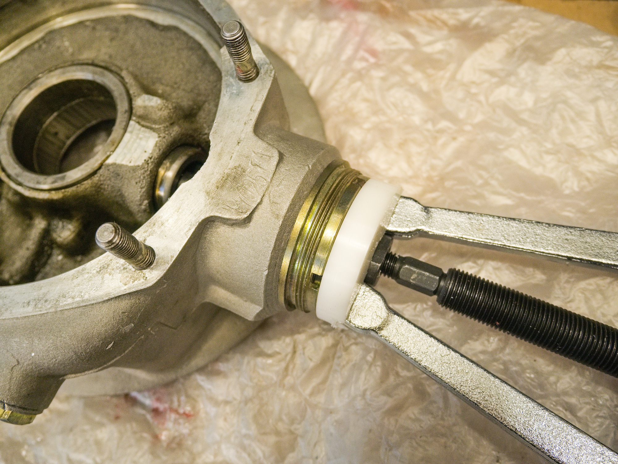 The existing pinion gear race in the FD needs to be removed. A simple task using a Blind Hole Puller (from a Blind Hole Collet Bearing Race and Seal Puller Extractor Kit in case you are looking for such puller), and a piece of protecting plastic.