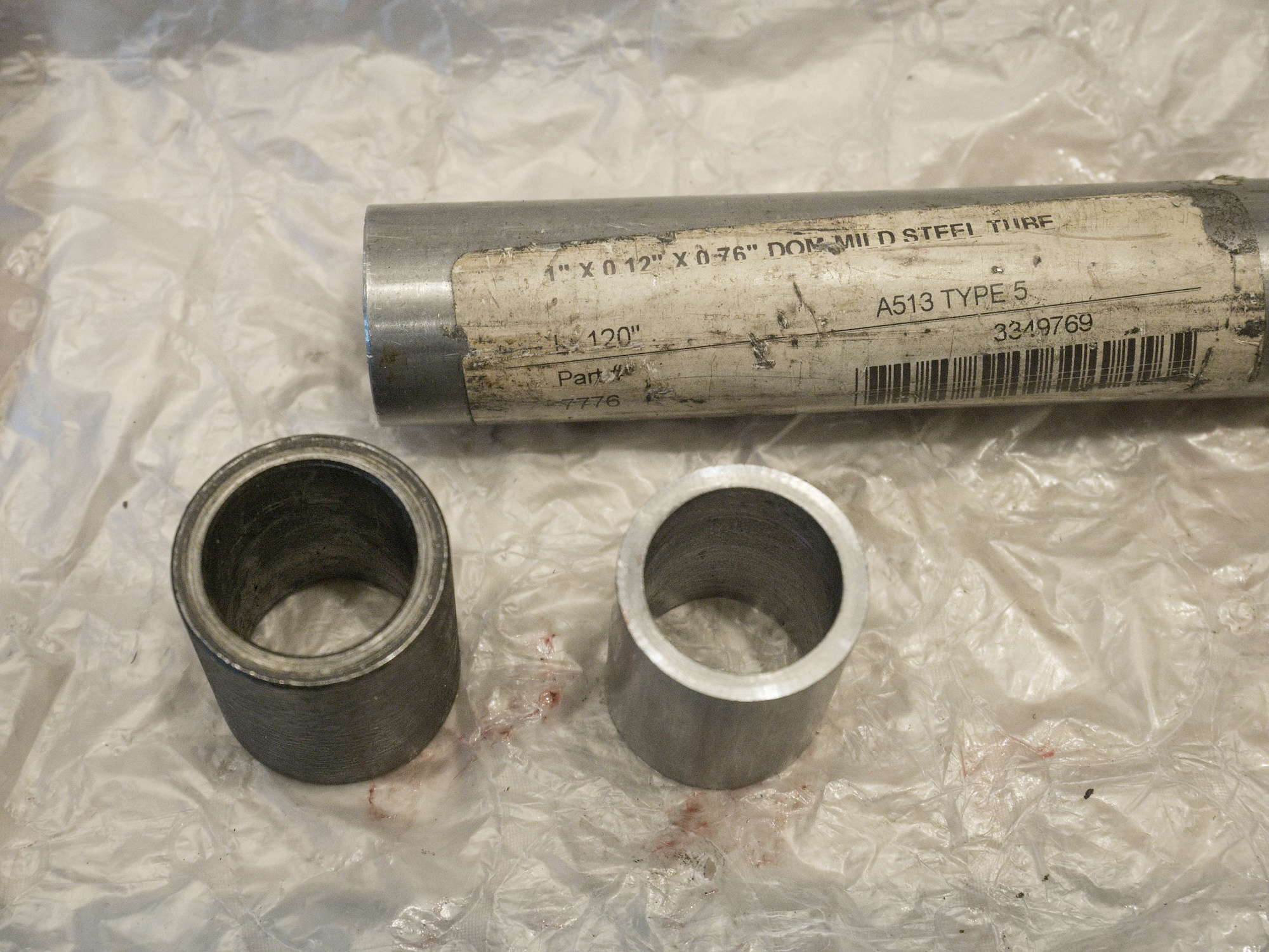 The distance bushing is made out of 1"x0.12"x0.76" DOM Mild Steel Tube A513 and drilled to an internal diameter of 20mm on the lathe. The old one was rather sloppy and was not perfectly even.