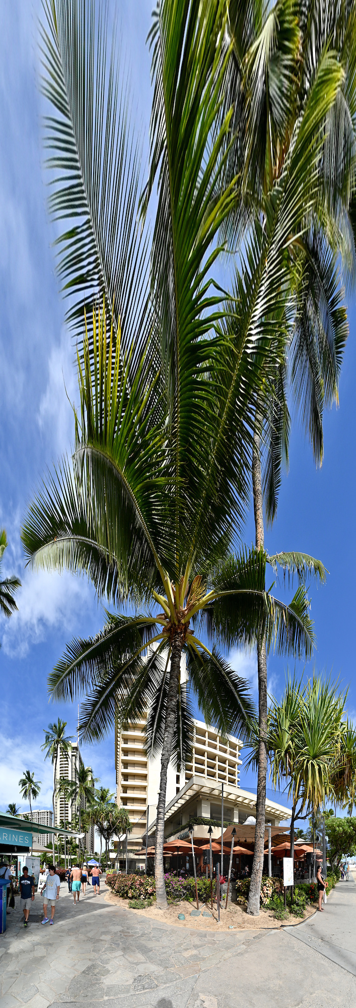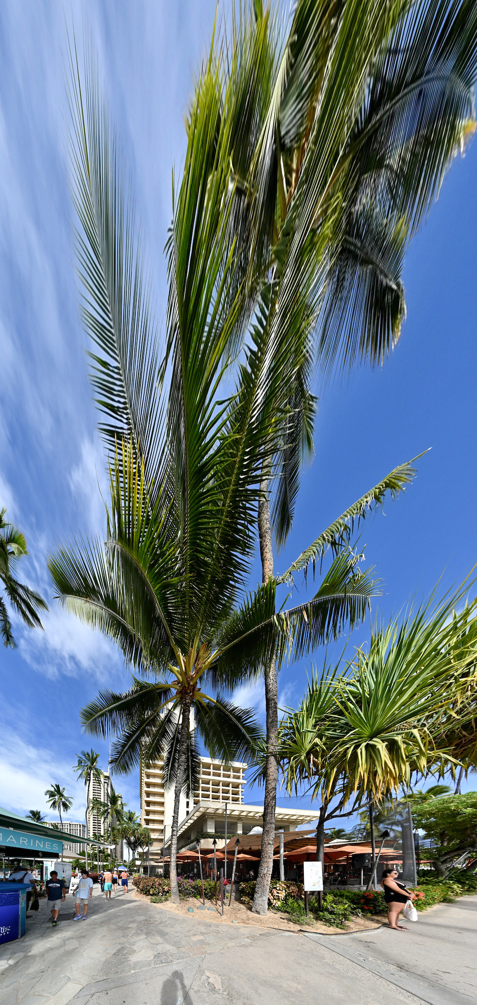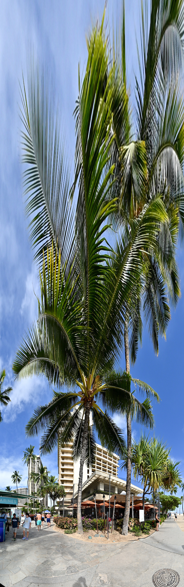 I wanted to take a photo of a tall object but could not step back for a normal view angle. In this case to capture the restaurant with its palm trees from the pathway.