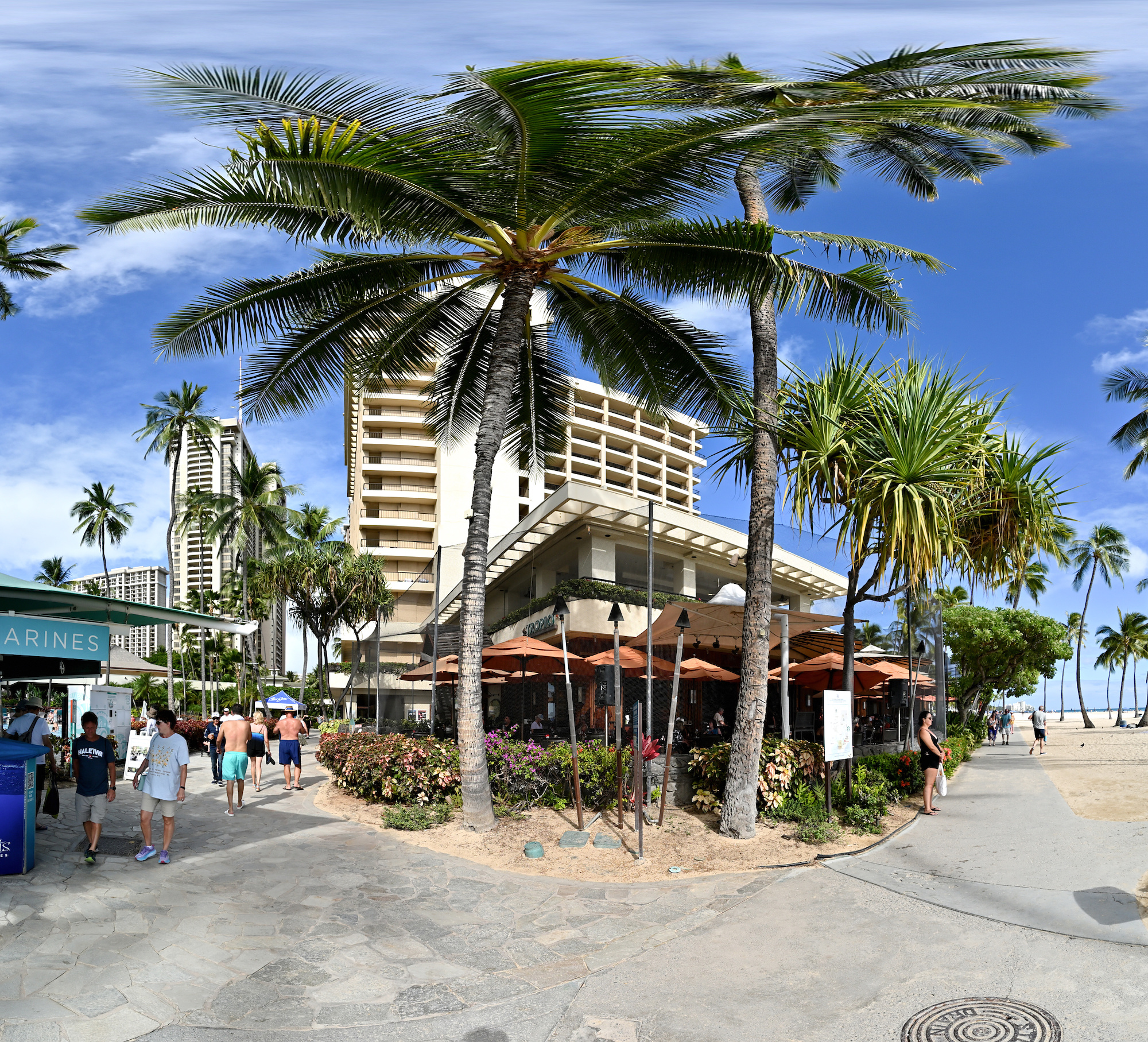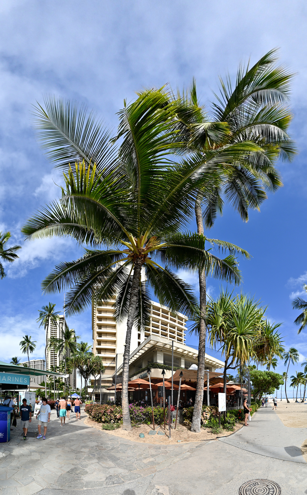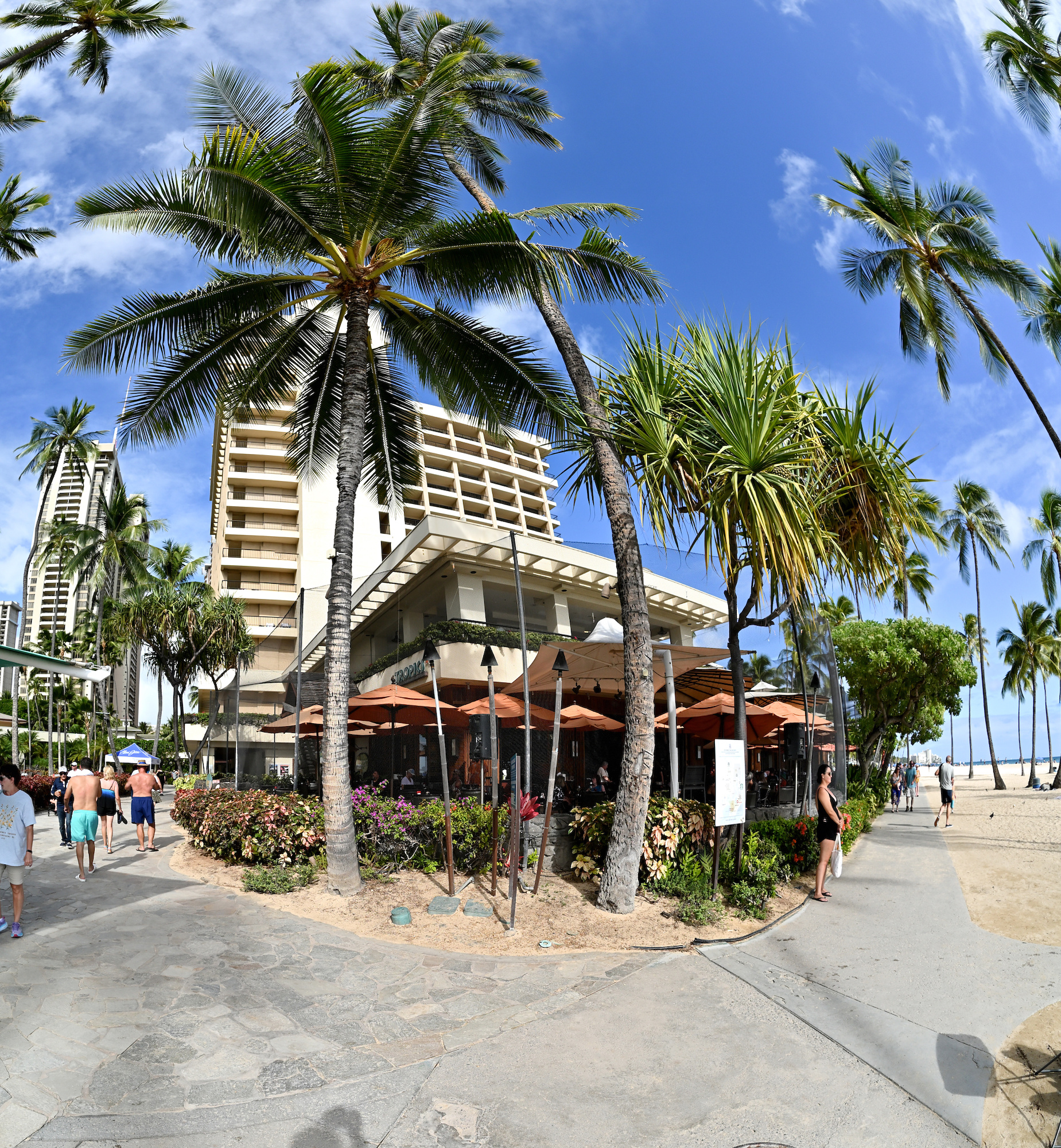 I wanted to take a photo of a tall object but could not step back for a normal view angle. In this case to capture the restaurant with its palm trees from the pathway.